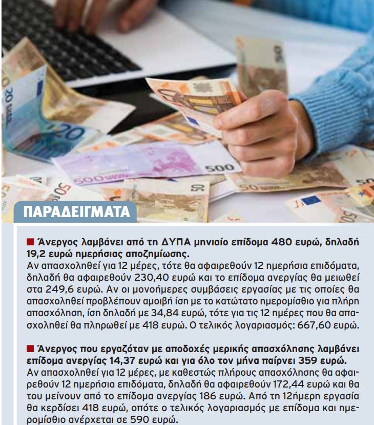 1 Επιδοτούμενοι άνεργοι με σποραδική απασχόληση: Δίνεται η δυνατότητα σε ανέργους που απασχολούνται με συμβάσεις εργασίας ορισμένου χρόνου μίας ημέρας να εργάζονται χωρίς να χάνουν το επίδομα ανεργίας. Η ρύθμιση αυτή ευνοεί τις συμβάσεις κατά παραγγελία, ή αλλιώς τις «συμβάσεις μηδενικών ωρών». Αυτό που λέει η διάταξη είναι ότι ένας άνεργος που παίρνει επίδομα και τύχει να εργαστεί 7 μέρες μέσα στον μήνα δεν θα χάσει όλο το επίδομα, αλλά θα του αφαιρεθούν 7 ημερήσια επιδόματα ανεργίας. Με τη νέα διάταξη οι άνεργοι με επίδομα έχουν μεγαλύτερο κίνητρο από κάποιον άλλον άνεργο που δεν λαμβάνει επίδομα στο να συνάπτουν ημερήσιες συμβάσεις για ευκαιριακή 3ήμερη εβδομαδιαία απασχόληση (μέχρι 12 ήμερες τον μήνα), καθώς αίρεται η απαγόρευση που ίσχυε ως τώρα και θα έχουν αυξημένο εισόδημα με μεροκάματο και ένα μέρος του επιδόματος ανεργίας.