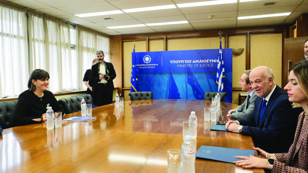 Η πολιτική ηγεσία του υπουργείου Δικαιοσύνης επανέλαβε τη σταθερή δέσμευσή της να συνεχίσει τη συνδρομή της χώρας στο έργο της Ευρωπαϊκής Εισαγγελίας για την καταπολέμηση του οικονομικού εγκλήματος και αναφέρθηκε στα μέτρα στήριξης που λήφθηκαν για την ενίσχυση και αποδοτική λειτουργία του Γραφείου των Ευρωπαίων εισαγγελέων στην Ελλάδα.