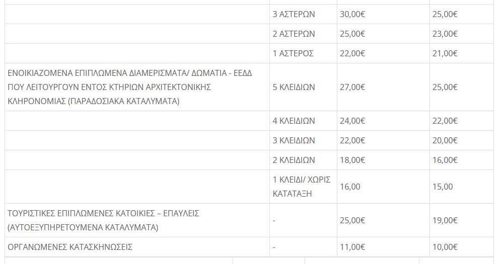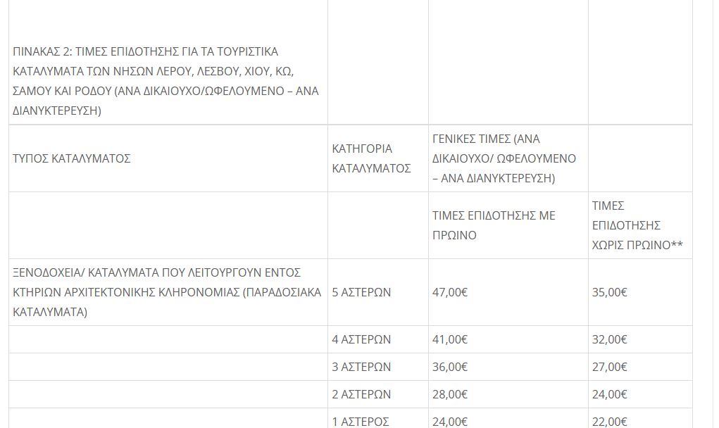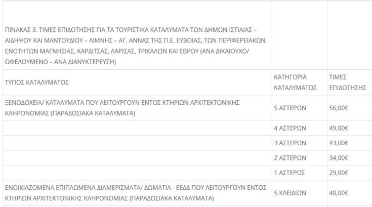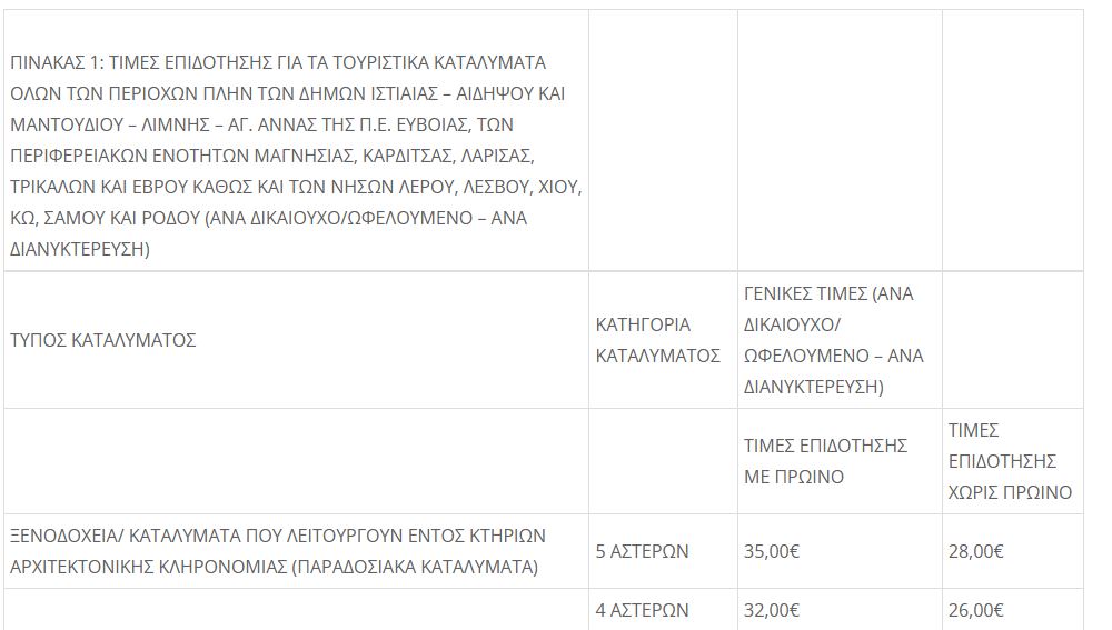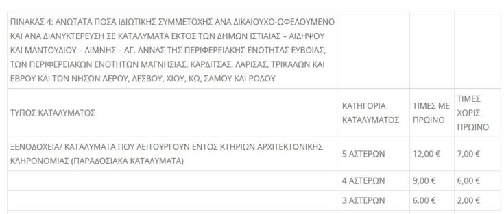 3. Οι δικαιούχοι για τη διαμονή τους στα καταλύματα όλης της χώρας, πλην όσων βρίσκονται στους Δήμους Ιστιαίας – Αιδηψού και Μαντουδίου- Λίμνης – Αγ. Άννας της Π.Ε. Ευβοίας, καθώς και στις Π.Ε. Μαγνησίας, Καρδίτσας, Λάρισας, Τρικάλων, Έβρου και στις νήσους Λέρο, Λέσβο, Χίο, Κω, Σάμο και Ρόδο, καταβάλλουν ιδιωτική συμμετοχή που δεν μπορεί να υπερβαίνει τα ανώτατα όρια του παρακάτω πίνακα ανάλογα με την περιοχή, τον τύπο και την κατηγορία του τουριστικού καταλύματος.