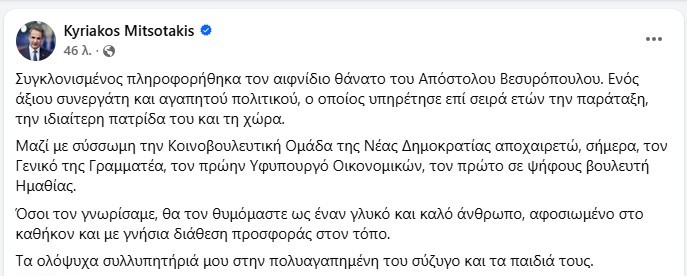 Η ανάρτηση του Κυριάκου Μητσοτάκη: «Συγκλονισμένος πληροφορήθηκα τον αιφνίδιο θάνατο του Απόστολου Βεσυρόπουλου. Ενός άξιου συνεργάτη και αγαπητού πολιτικού, ο οποίος υπηρέτησε επί σειρά ετών την παράταξη, την ιδιαίτερη πατρίδα του και τη χώρα. Μαζί με σύσσωμη την Κοινοβουλευτική Ομάδα της Νέας Δημοκρατίας αποχαιρετώ, σήμερα, τον Γενικό της Γραμματέα, τον πρώην Υφυπουργό Οικονομικών, τον πρώτο σε ψήφους βουλευτή Ημαθίας. Όσοι τον γνωρίσαμε, θα τον θυμόμαστε ως έναν γλυκό και καλό άνθρωπο, αφοσιωμένο στο καθήκον και με γνήσια διάθεση προσφοράς στον τόπο. Τα ολόψυχα συλλυπητήριά μου στην πολυαγαπημένη του σύζυγο και τα παιδιά τους».