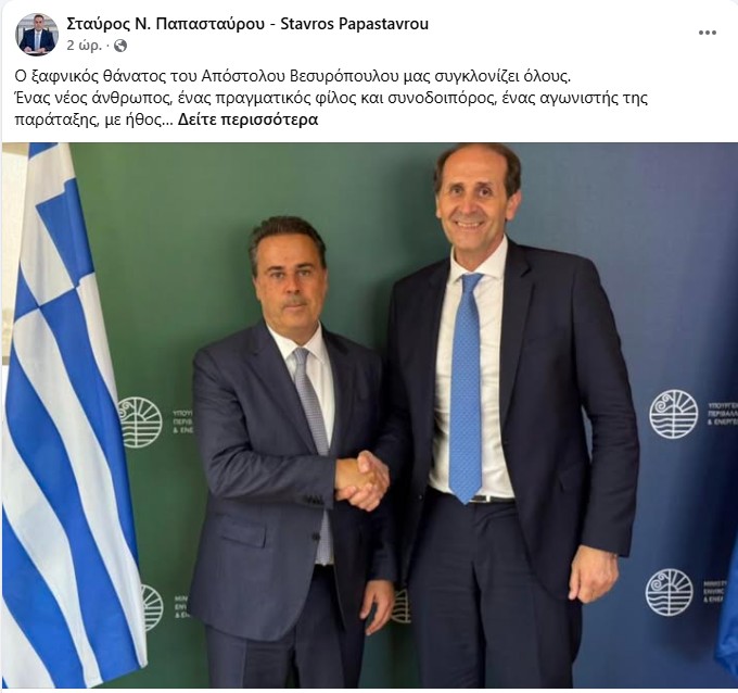 Η δήλωση του Υπουργού Περιβάλλοντος και Ενέργειας, Σταύρου Παπασταύρου: «Ο ξαφνικός θάνατος του Απόστολου Βεσυρόπουλου μας συγκλονίζει όλους. Ένας νέος άνθρωπος, ένας πραγματικός φίλος και συνοδοιπόρος, ένας αγωνιστής της παράταξης, με ήθος, εργατικότητα και συνέπεια. Ειλικρινή συλλυπητήρια στην οικογένειά του».