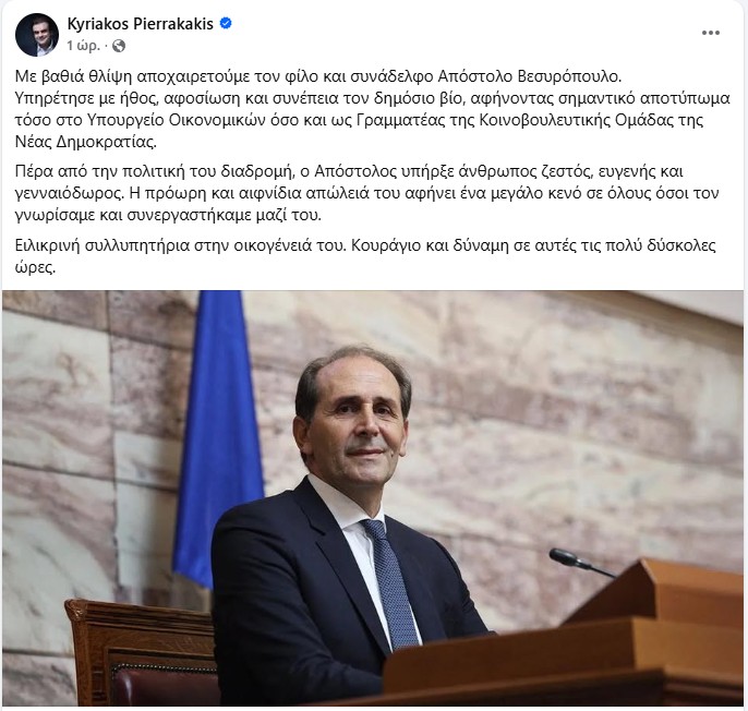 Η ανάρτηση του υπουργού Οικονομικών, Κυριάκου Πιερρακάκη: «Με βαθιά θλίψη αποχαιρετούμε τον φίλο και συνάδελφο Απόστολο Βεσυρόπουλο. Υπηρέτησε με ήθος, αφοσίωση και συνέπεια τον δημόσιο βίο, αφήνοντας σημαντικό αποτύπωμα τόσο στο Υπουργείο Οικονομικών όσο και ως Γραμματέας της Κοινοβουλευτικής Ομάδας της Νέας Δημοκρατίας. Πέρα από την πολιτική του διαδρομή, ο Απόστολος υπήρξε άνθρωπος ζεστός, ευγενής και γενναιόδωρος. Η πρόωρη και αιφνίδια απώλειά του αφήνει ένα μεγάλο κενό σε όλους όσοι τον γνωρίσαμε και συνεργαστήκαμε μαζί του. Ειλικρινή συλλυπητήρια στην οικογένειά του. Κουράγιο και δύναμη σε αυτές τις πολύ δύσκολες ώρες».