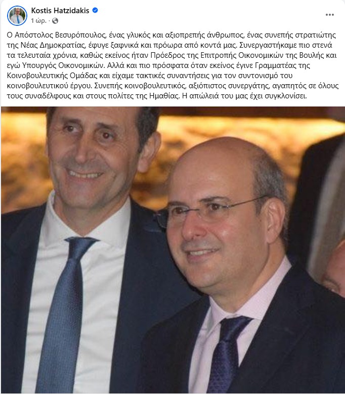Ο θάνατος του φίλου Γραμματέα της Κοινοβουλευτικής Ομάδας και Βουλευτή Ημαθίας της ΝΔ, Απόστολου Βεσυρόπουλου, προκαλεί τη βαθύτατη θλίψη όλων μας.