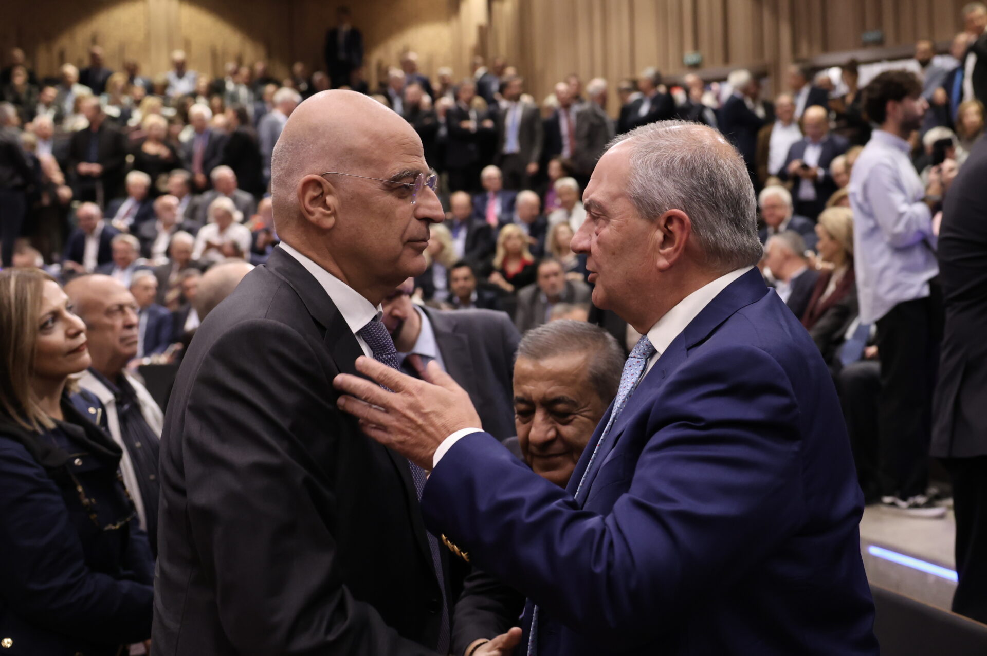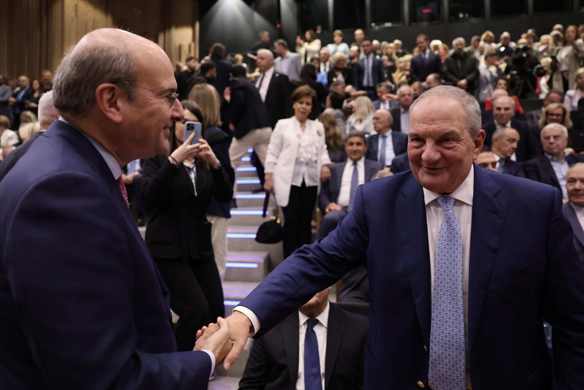 Το «παρών» έδωσε και ο πρώην πρωθυπουργός Κώστας Καραμανλής, με τον οποίο ο κ. Μητσοτάκης αντάλλαξε θερμή χειραψία κατά την άφιξή του στην εκδήλωση.