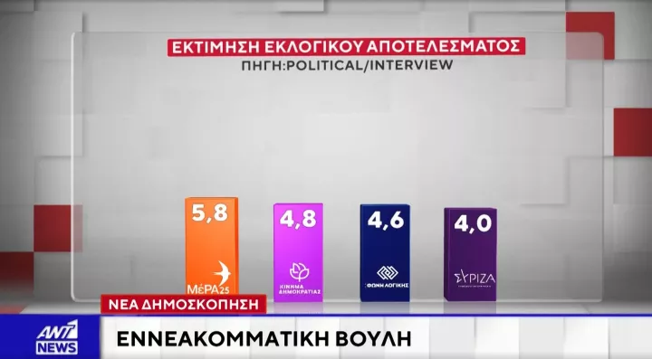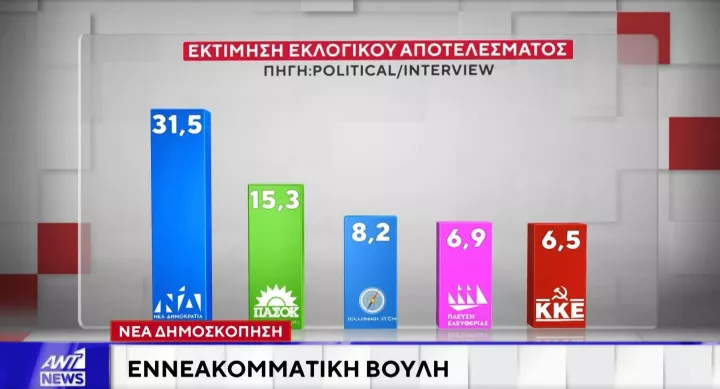 Η Νέα Δημοκρατία διατηρεί ισχυρό προβάδισμα στην πρόθεση ψήφου, σύμφωνα με τη νέα δημοσκόπηση της Interview για την εφημερίδα Political, που παρουσιάστηκε στον Ant1. Το κυβερνών κόμμα συγκεντρώνει 31,5%, αυξάνοντας τη διαφορά του από το ΠΑΣΟΚ, που ακολουθεί με 15,3%. Στην εκτίμηση εκλογικού αποτελέσματος, την τρίτη θέση καταλαμβάνει η Ελληνική Λύση με 8,2%, ενώ η Πλεύση Ελευθερίας βρίσκεται στο 6,9% και το ΚΚΕ στο 6,5%. Ακολουθούν η ΜέΡΑ25 με 5,8%, το Κίνημα Δημοκρατίας με 4,8%, η Φωνή της Λογικής με 4,6% και ο ΣΥΡΙΖΑ με μόλις 4%.