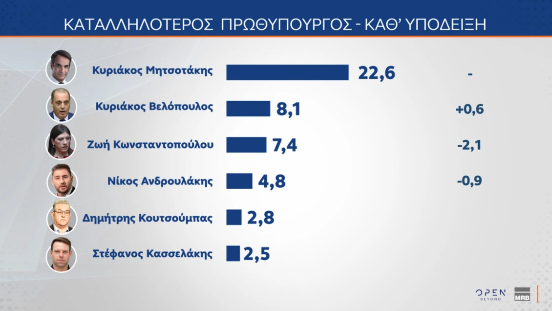 Καταλληλότερος για πρωθυπουργός παραμένει ο Κυριάκος Μητσοτάκης, τον οποίο προτιμά το 22,6% των ερωτηθέντων.