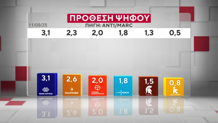 Η τελευταία δημοσκόπηση της Marc για τον ΑΝΤ1 καταγράφει σταθερό προβάδισμα για τη Νέα Δημοκρατία, η οποία συγκεντρώνει 30,5% στην εκτίμηση ψήφου. Το ΠΑΣΟΚ ακολουθεί με 14%, σημειώνοντας μικρή άνοδο, ενώ τα υπόλοιπα κόμματα παρουσιάζουν οριακές μεταβολές.