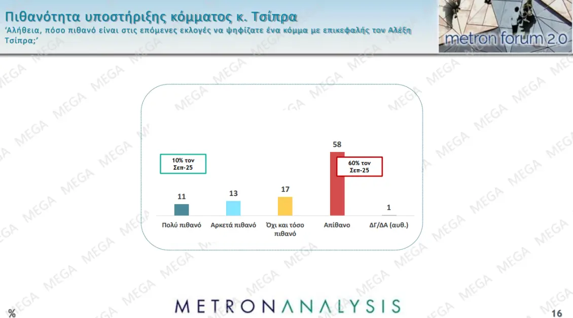 Στην πιθανότητα ψήφου το κόμμα Τσίπρα λαμβάνει 24%, με τον σκληρό πυρήνα του να ανεβαίνει μία μονάδα σε σχέση με τον Σεπτέμβριο φτάνοντας στο 11% και τον ευρύτερο χώρο πιθανής ψήφου στο 13%, με άνοδο 2 μονάδων μέσα σε έναν μήνα. Η πλειοψηφία εκείνων που δηλώνουν έτοιμοι να ψηφίζουν ένα κόμμα Τσίπρα αυτοτοποθετούνται στην Κεντροαριστερά και την Αριστερά, διατηρεί όμως μειοψηφικά, αλλά όχι ασήμαντα ερείσματα τόσο στον χώρο του Κέντρου, όσο και μεταξύ των κεντροδεξιών και των Δεξιών.