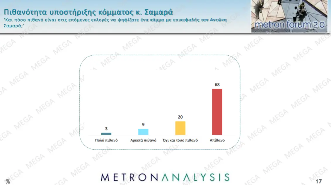 Χαμηλά – μόλις στο 3% – μετρήθηκε και σε αυτή τη δημοσκόπηση ο σκληρός πυρήνας του «κόμματος Σαμαρά». Μαζί με εκείνους που δηλώνουν ότι είναι «αρκετά πιθανό» να το ψηφίσουν φτάνει σε μία πιθανότητα ψήφου 12%, με το κοινό του να καταγράφεται κυρίως μεταξύ εκείνων που δηλώνουν Δεξιοί και κεντροδεξιοί, ενώ φαίνεται και ένα αξιοπρεπές πέρασμά του στους Κεντρώους, ακόμα και στους Κεντροαριστερούς.