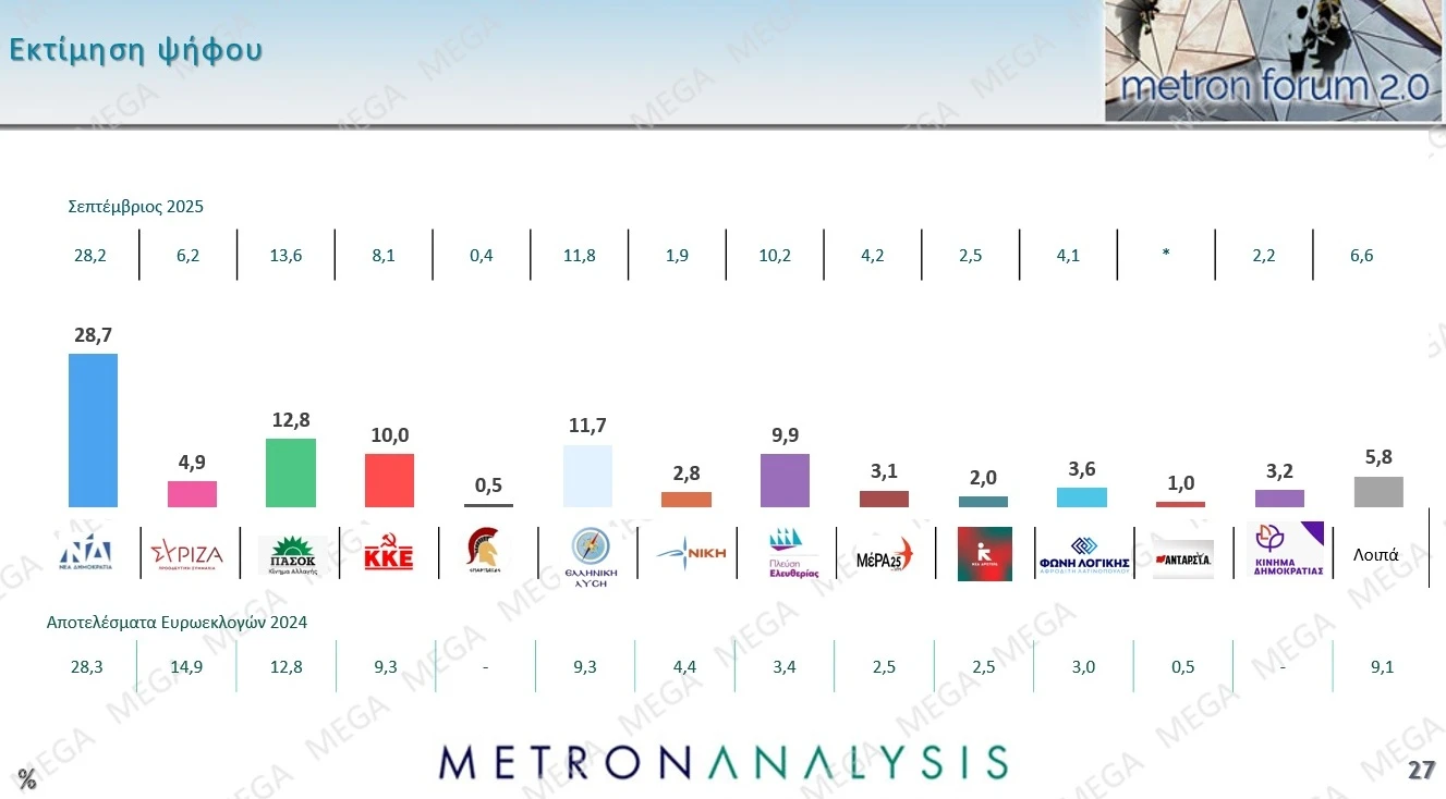 ΝΔ 28,7% (από 28,2% στην προηγούμενη δημοσκόπηση τον Σεπτέμβριο του 2025)