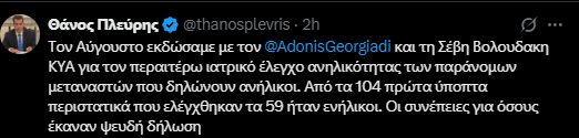 Ανάρτηση για τα αποτελέσματα του νέου συστήματος προσδιορισμού ηλικίας των αιτούντων άσυλο έκανε ο υπουργός Μετανάστευσης και Ασύλου, Θάνος Πλεύρης, μέσω της πλατφόρμας Χ (Twitter).