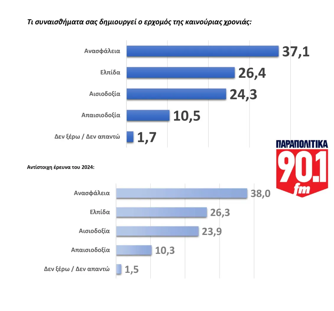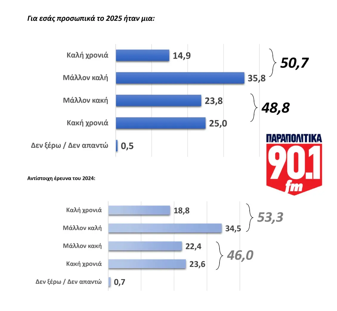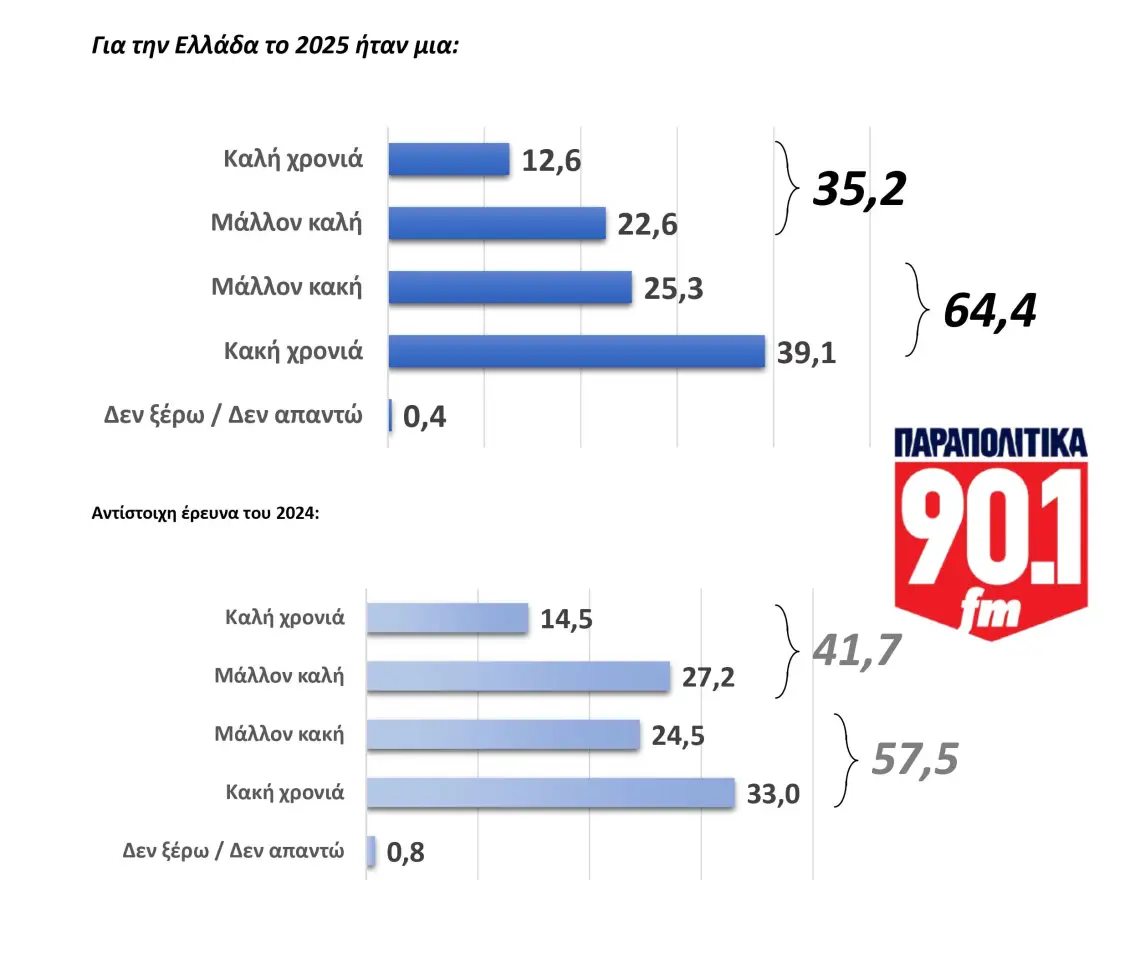 Το 2025 κλείνει για τους Έλληνες με κυρίαρχα αισθήματα ανασφάλειας και αβεβαιότητας, αλλά και με ένα μικρό –αν και υπαρκτό– παράθυρο ελπίδας για τη χρονιά που έρχεται. Το Βαρόμετρο της GPO για το ραδιόφωνο των ΠΑΡΑΠΟΛΙΤΙΚΩΝ επιχειρεί να αποτυπώσει το αποτύπωμα μιας δύσκολης χρονιάς, να συγκρίνει τις στάσεις των πολιτών με το 2024 και να σκιαγραφήσει τις προσδοκίες για το 2026.
