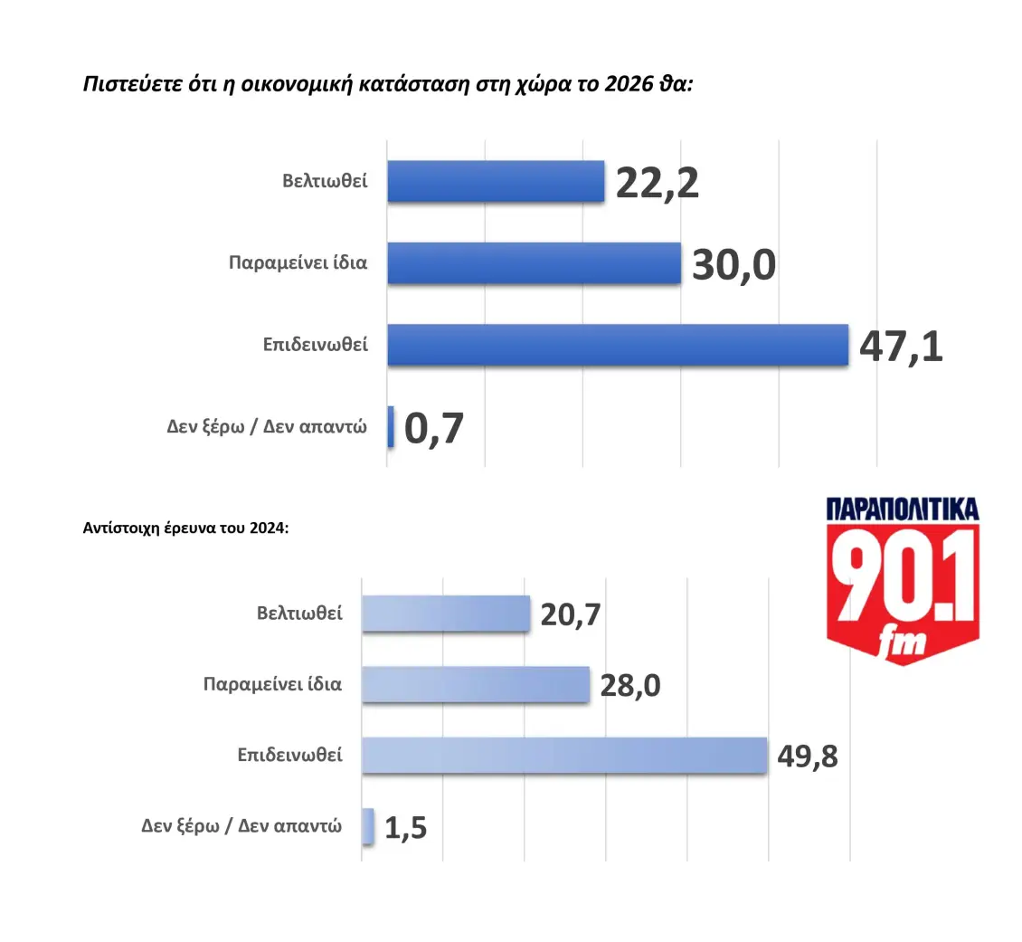 Η εικόνα παραμένει βαριά και απαισιόδοξη, με σχεδόν έναν στους δύο πολίτες να προβλέπει χειροτέρευση των οικονομικών μεγεθών.