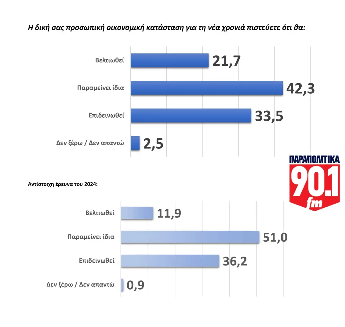 Εδώ καταγράφεται μια σχετική ανάσα σε σύγκριση με το 2024. Οι πολίτες εμφανίζονται πιο συγκρατημένα αισιόδοξοι για τα δικά τους οικονομικά, παρά για τη συνολική πορεία της χώρας.