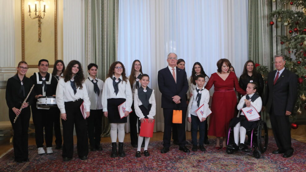 Τη Μπάντα των Ενόπλων Δυνάμεων, την Προεδρική Φρουρά, μαθητές και αντιπροσωπείες πολιτιστικών συλλόγων υποδέχθηκε σήμερα, Τετάρτη 24 Δεκεμβρίου, ο Πρόεδρος της Δημοκρατίας, Κωνσταντίνος Τασούλας, στο Προεδρικό Μέγαρο. Οι χορωδίες έψαλλαν τα παραδοσιακά χριστουγεννιάτικα κάλαντα, γεμίζοντας τους χώρους του Μεγάρου με μελωδίες και χαρά.