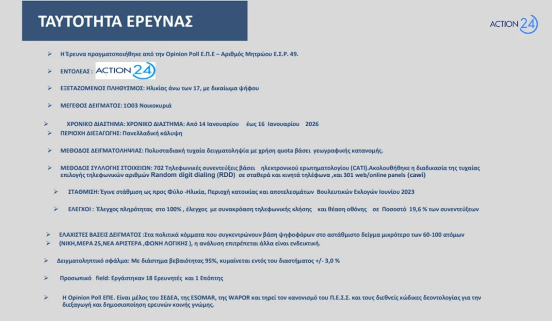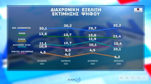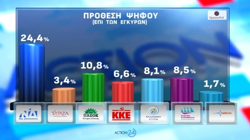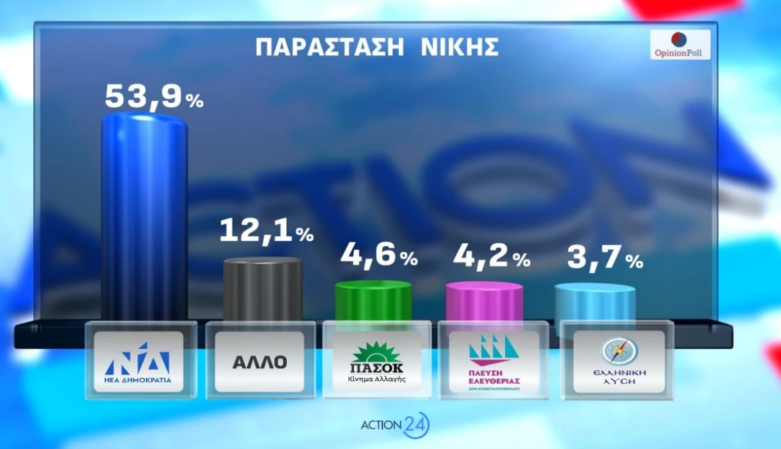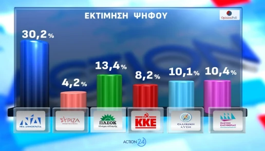 Ισχυρό προβάδισμα διατηρεί η Νέα Δημοκρατία στη νέα δημοσκόπηση της Opinion Poll για λογαριασμό του Action 24, επιβεβαιώνοντας την πρωτιά της τόσο στην εκτίμηση ψήφου όσο και στους δείκτες πολιτικής κυριαρχίας, σε μια περίοδο έντονων κοινωνικών και γεωπολιτικών ανησυχιών.