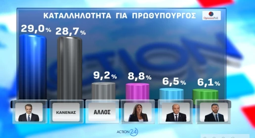 Στην ερώτηση για την καταλληλότητα για τη θέση του πρωθυπουργού, ο Κυριάκος Μητσοτάκης προηγείται με 29%, με τη δεύτερη επιλογή να είναι το «Κανένας» με 28,7%. Ακολουθούν η Ζωή Κωνσταντοπούλου με 8,8%, ο Κυριάκος Βελόπουλος με 6,5% και ο Νίκος Ανδρουλάκης με 6,1%.