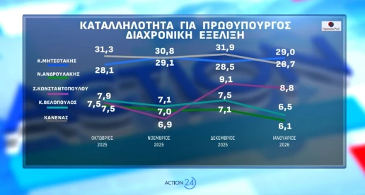 Η διαχρονική εξέλιξη δείχνει σχετική σταθερότητα για τον πρωθυπουργό, με μικρή κάμψη σε σχέση με το φθινόπωρο του 2025, ενώ άνοδο καταγράφει η Ζωή Κωνσταντοπούλου.
