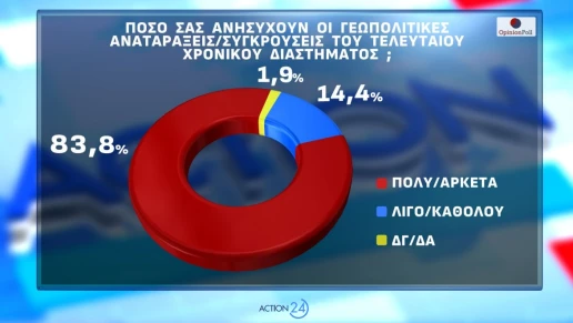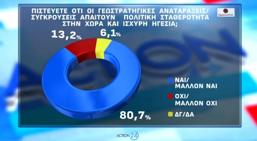 Ιδιαίτερα υψηλή είναι η ανησυχία για τις γεωπολιτικές εξελίξεις, με το 83,8% να δηλώνει ότι ανησυχεί πολύ ή αρκετά. Παράλληλα, το 80,7% θεωρεί ότι οι διεθνείς αναταράξεις καθιστούν αναγκαία την πολιτική σταθερότητα και την ισχυρή ηγεσία στη χώρα.