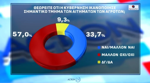 Στο ζήτημα των αγροτικών κινητοποιήσεων, η κοινή γνώμη εμφανίζεται διχασμένη ως προς τον αποκλεισμό των εθνικών οδών, με πλειοψηφία να διαφωνεί. Η πλειονότητα, πάντως, εκτιμά ότι η κυβέρνηση δεν ικανοποίησε τα βασικά αιτήματα των αγροτών, ενώ η στάση της αντιπολίτευσης κρίνεται σε μεγάλο βαθμό αρνητικά.
