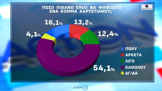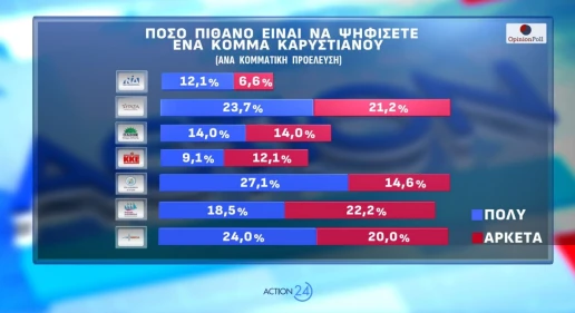 Ιδιαίτερο ενδιαφέρον παρουσιάζουν τα ευρήματα για το υπό ίδρυση κόμμα της Μαρίας Καρυστιανού. Το 16,1% των ερωτηθέντων δηλώνει ότι είναι «πολύ» πιθανό να το ψηφίσει και το 13,2% «αρκετά», ενώ το 54,1% απαντά «καθόλου».
