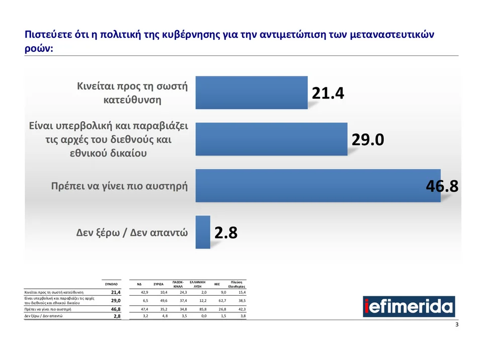 Η μεγαλύτερη ομάδα, ποσοστό 46,8%, ζητάει από το κράτος να αυστηροποιήσει το πλαίσιο της μεταναστευτικής πολιτικής. Η τάση αυτή επικρατεί κυρίως στους ψηφοφόρους των δεξιών κομμάτων: στην Ελληνική Λύση φτάνει το 85,8% και στη Νέα Δημοκρατία το 47,4%. Παράλληλα, υποστηρικτές της αυστηροποίησης υπάρχουν και σε ψηφοφόρους κομμάτων της Κεντροαριστεράς και Αριστεράς, όπως η Πλεύση Ελευθερίας (42,3%), ο ΣΥΡΙΖΑ (35,2%) και το ΠΑΣΟΚ (34,8%).