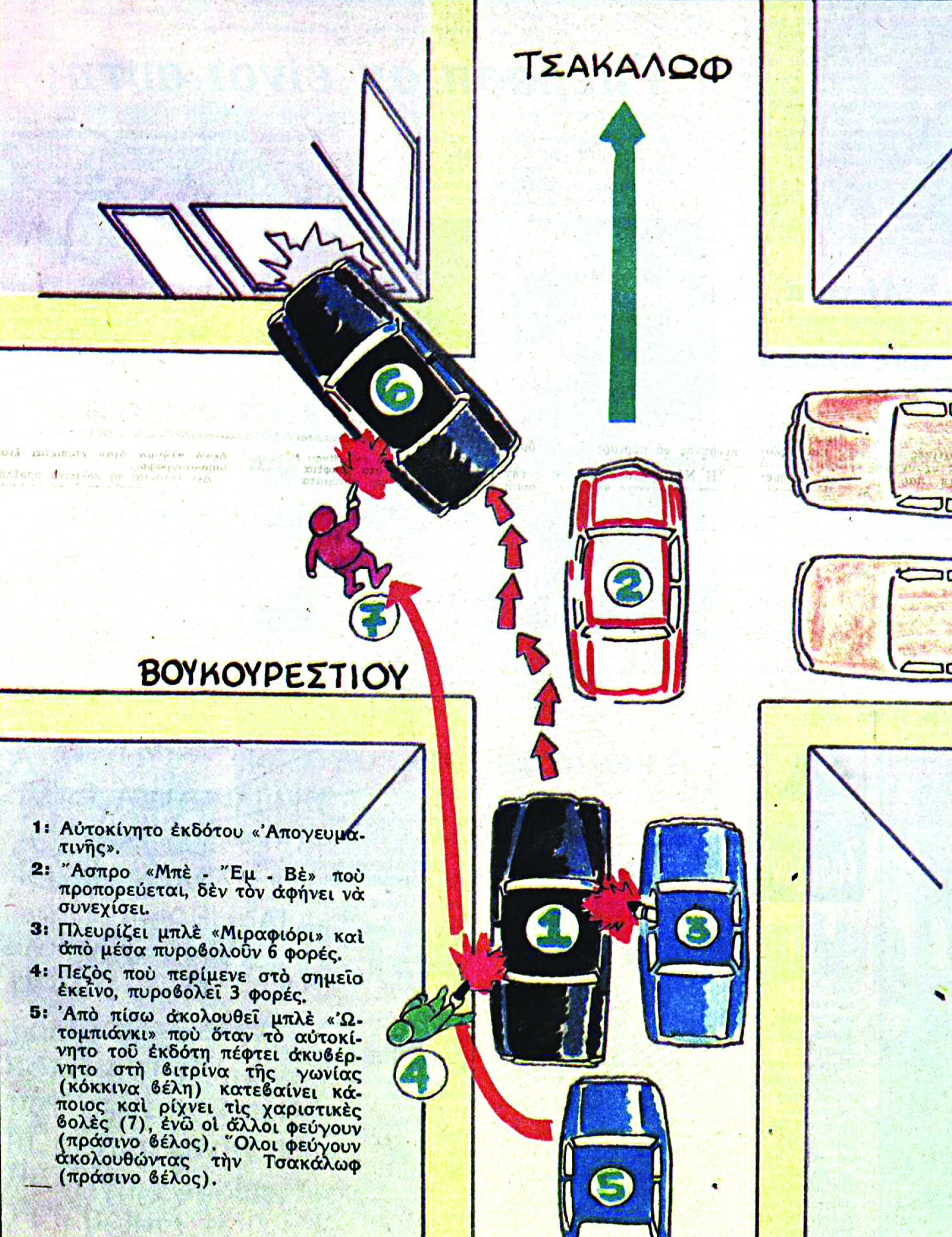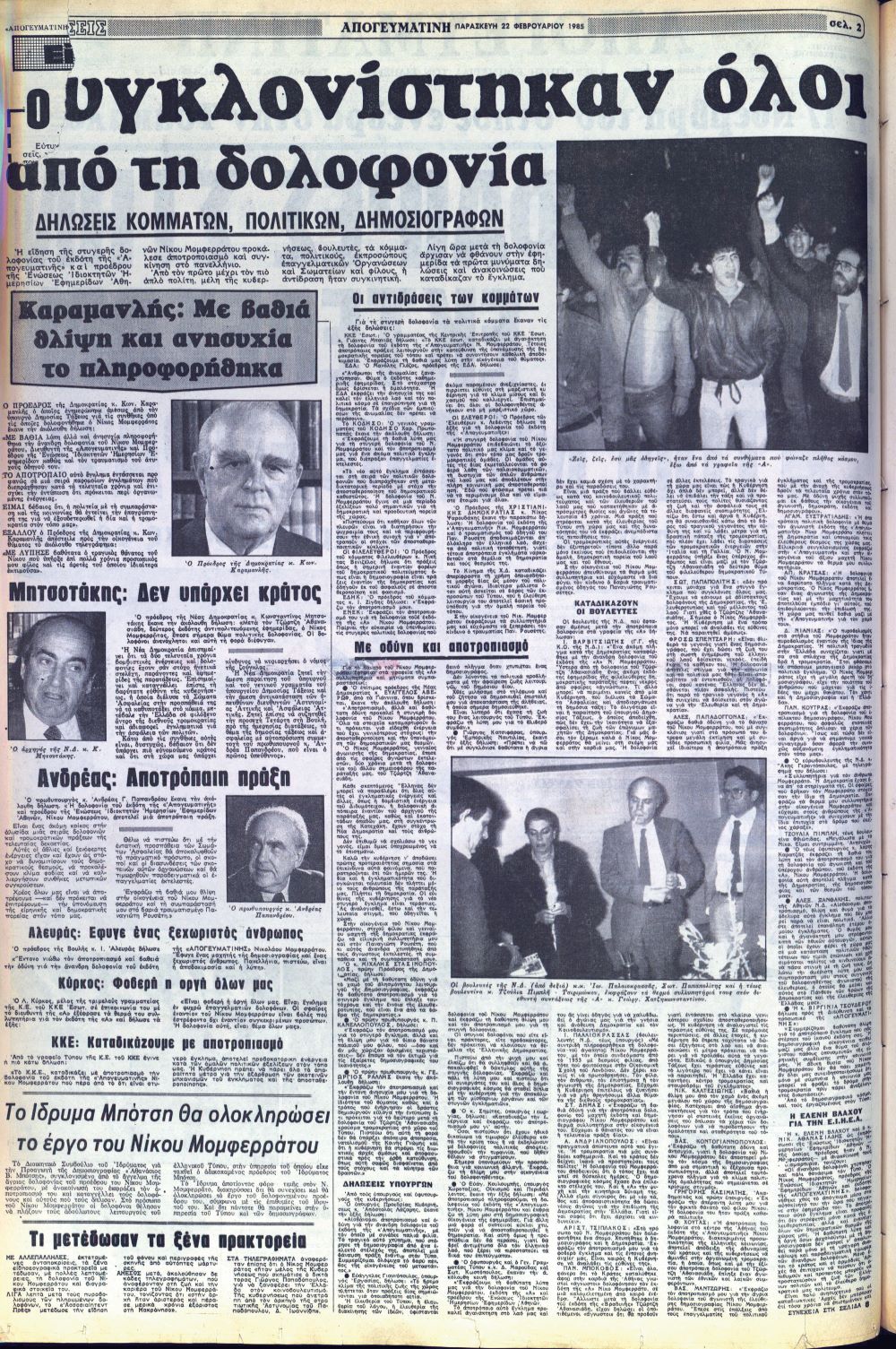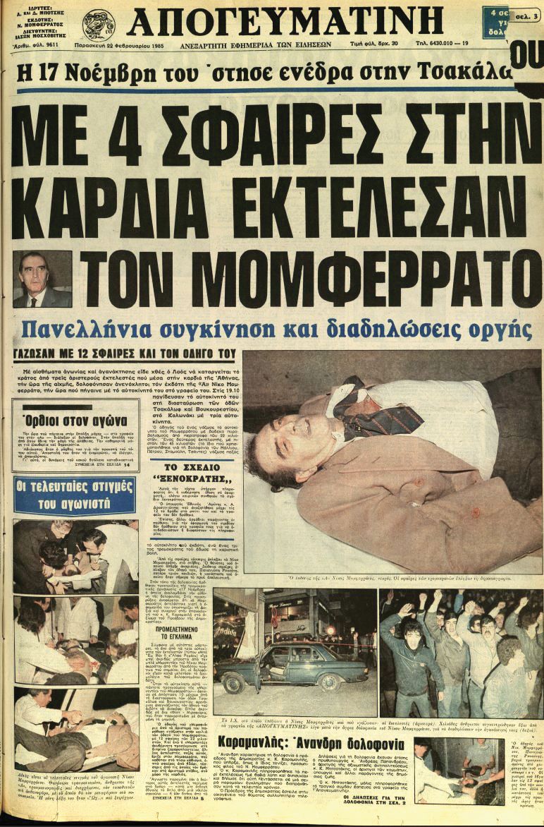 Εκείνο το χειμωνιάτικο απόγευμα του Φεβρουαρίου ακριβώς σαν σήμερα το 1985, τίποτε δεν προμήνυε ότι θα ήταν το τελευταίο της ζωής του εκδότη της «Απογευματινής», Νίκου Μομφεράτου. Ο Νίκος Μομφεράτος λίγα λεπτά μετά τις 18.00 ζήτησε από τον οδηγό του, Παναγιώτη Ρουσέτη, να πάνε στο σπίτι του στο Κολωνάκι. Ο εκδότης της «Α» βγήκε από τα γραφεία της εφημερίδας και κάθισε στο πίσω μέρος της Mercedes του. Οι δύο άνδρες δεν φαντάστηκαν ότι λίγο παρακάτω θα βρίσκονταν αντιμέτωποι με τους τρομοκράτες της «17 Νοέμβρη». Οι δρόμοι του κέντρου έσφυζαν από κίνηση και δέκα λεπτά μετά η Mercedes έφτανε στη διασταύρωση Βουκουρεστίου και Τσακάλωφ. Ο Ρουσέτης δεν έδωσε σημασία στο Fiat Mirafiori που βρέθηκε μπροστά του όταν μπήκε στην οδό Τσακάλωφ και, φτάνοντας στη συμβολή με τη Βουκουρεστίου, αγνόησε ένα σταθμευμένο Autobianchi στην αριστερή πλευρά του δρόμου.