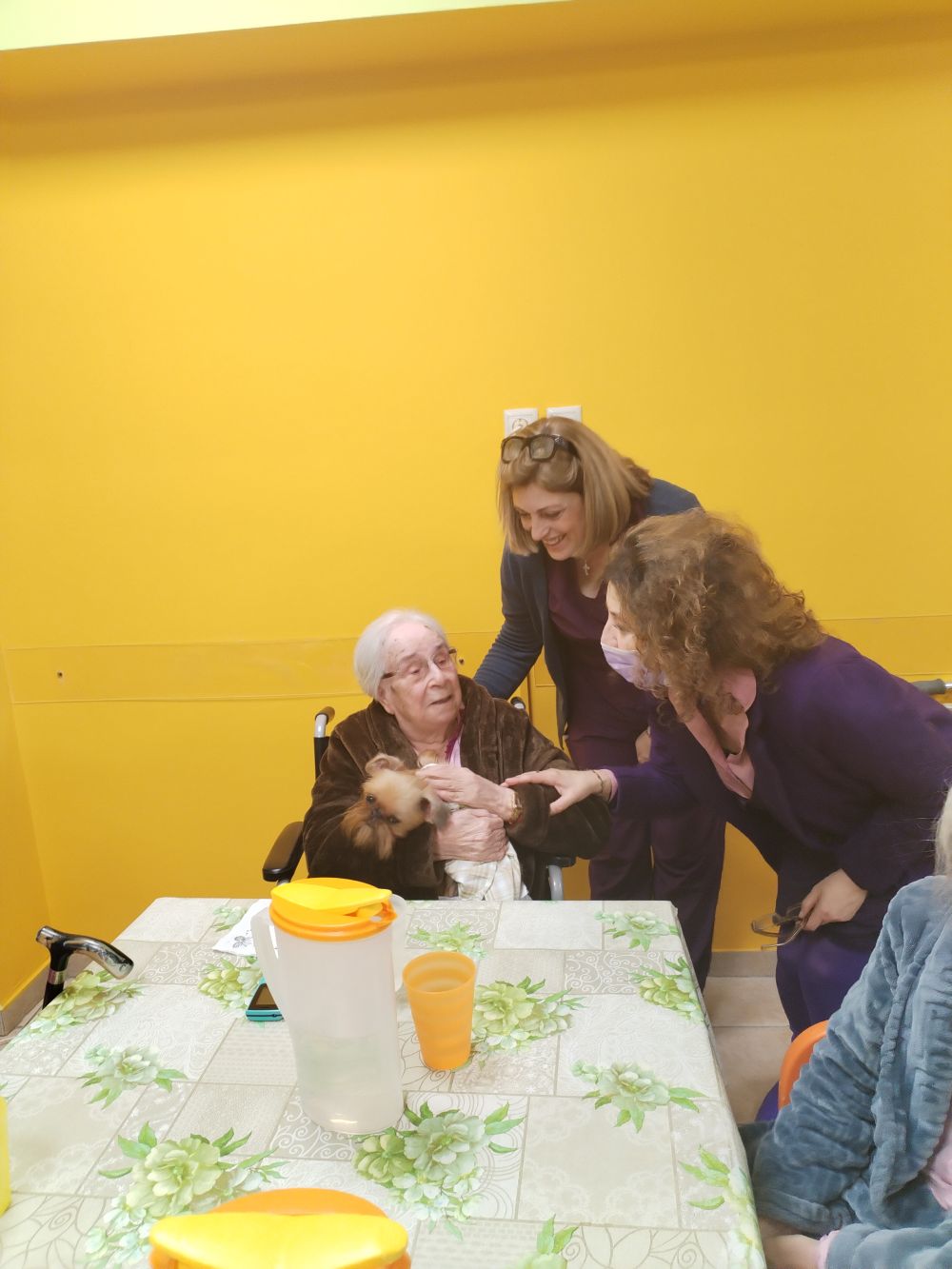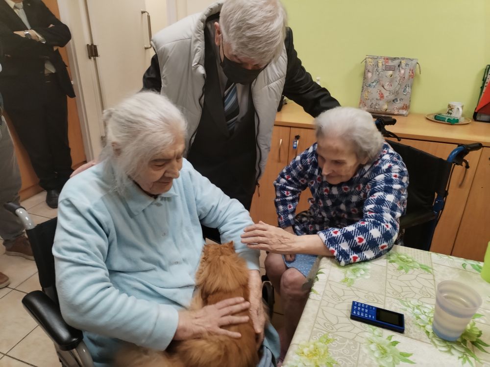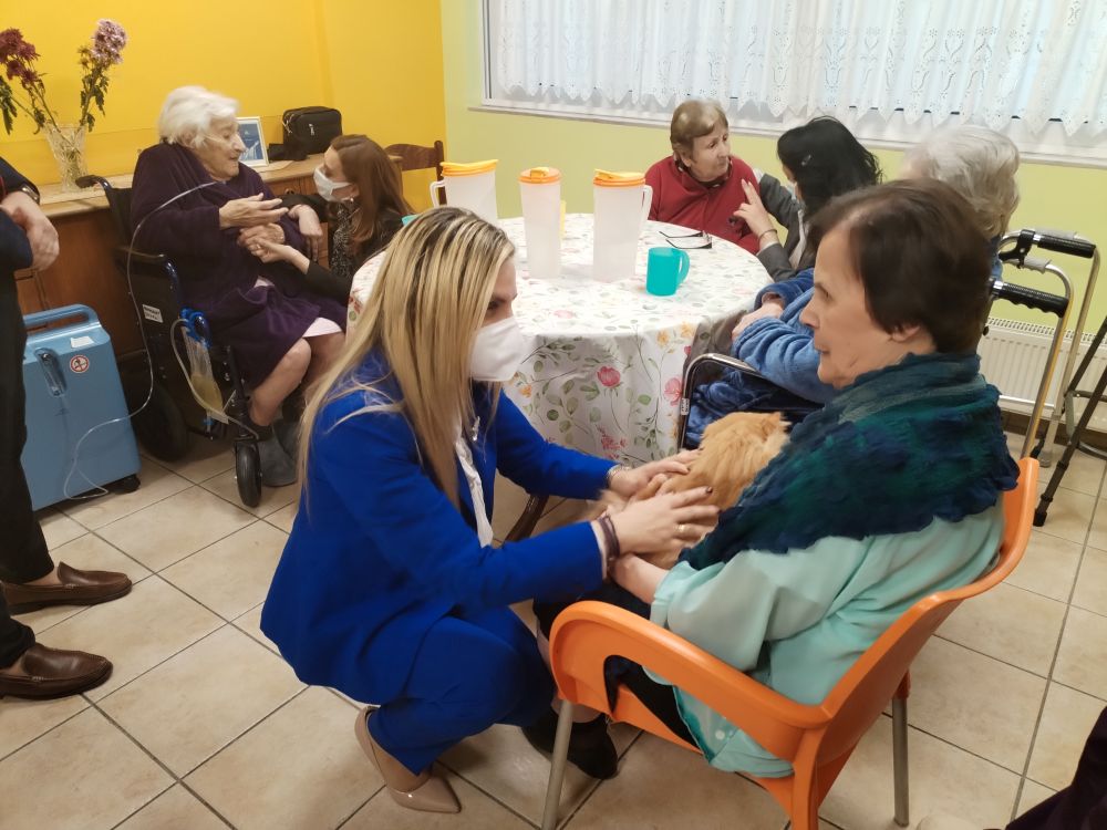Τους εμπειρογνώμονες της Γραμματείας υποδέχθηκε ο Πρόεδρος του ΔΣ κ. Ελευθέριος Σκιαδάς στον ζεστό χώρο του ιδρύματος, όπου φιλοξενούνται γυναίκες άπορες και χαμηλών εισοδημάτων ηλικίας από 72 έως και 100 ετών, προκειμένου να υλοποιηθεί θεραπευτική δράση από τον εξειδικευμένο φροντιστή και groomer, θετικό εκπαιδευτή ζώων συντροφιάς και ανάδοχο εθελοντή σκύλων οδηγών στη σχολή Liberty, κ. Άγγελο Νάτση. Οι φιλοξενούμενες μπόρεσαν να χαϊδέψουν και να κρατήσουν στην αγκαλιά τους δύο μικρόσωμα ζώα συντροφιάς, τον γάτο Τέλη και τη σκυλίτσα Έλλη, εισπράττοντας μοναδικές στιγμές χαράς και χαλάρωσης. Η καρδιά των στελεχών της ΝΔ γέμισε με ζεστασιά και συγκίνηση, αντικρίζοντας τον ενθουσιασμό στα πρόσωπα των φιλοξενούμενων γυναικών.