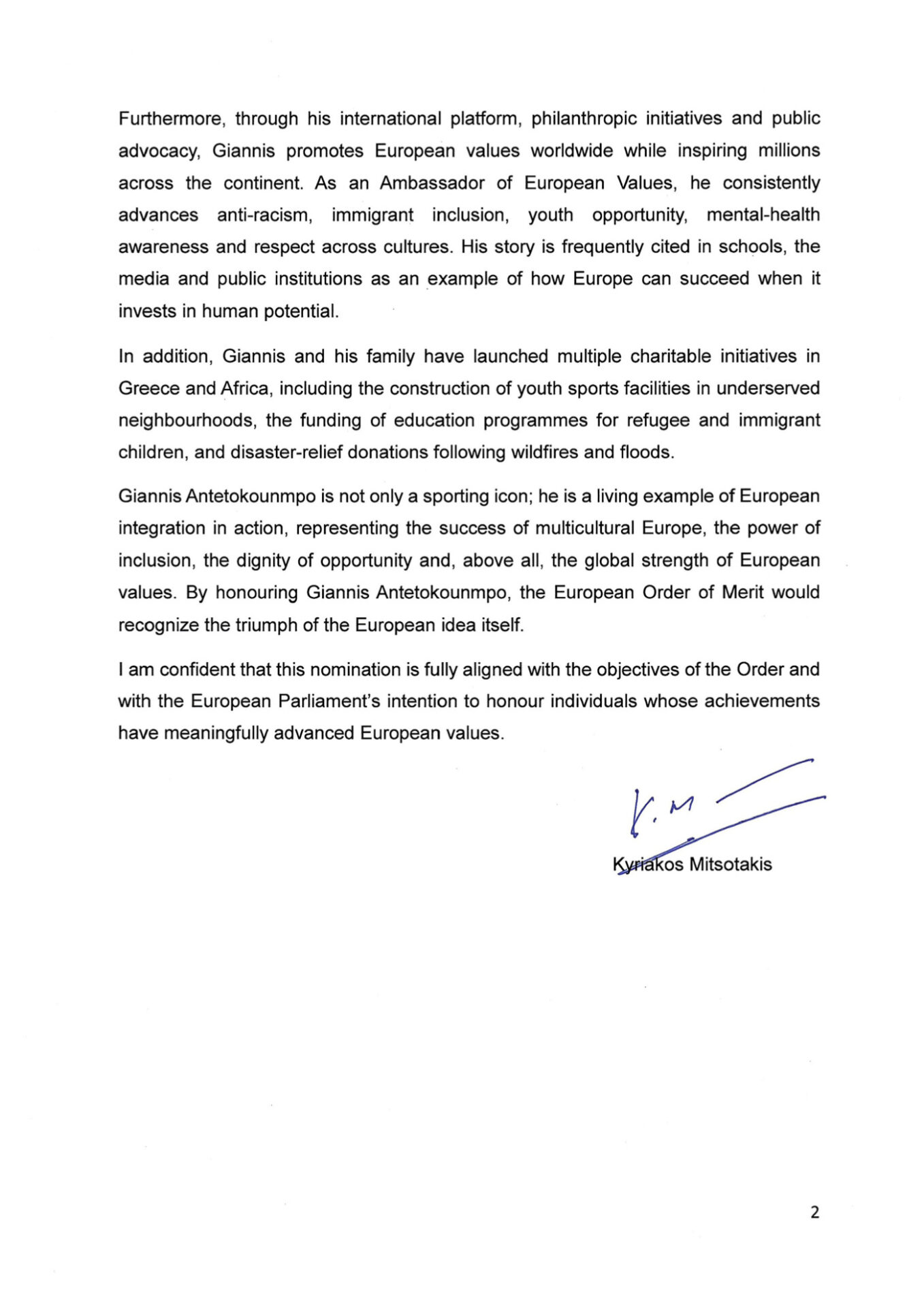 «Ο Γιάννης Αντετοκούνμπο είναι μια από τις πιο επιδραστικές παγκόσμιες προσωπικότητες της Ευρώπης, του οποίου η ιστορία ζωής, η δημόσια ηγεσία και η δέσμευση στα ανθρωπιστικά ιδεώδη ενσαρκώνουν τις βασικές αξίες της Ευρωπαϊκής Ένωσης: την ανθρώπινη αξιοπρέπεια, την ισότητα, την κοινωνική ένταξη, την πολυπολιτισμικότητα και τις ευκαιρίες», σημειώνει χαρακτηριστικά στην επιστολή του προς την κυρία Μετσόλα, ο κ. Μητσοτάκης.