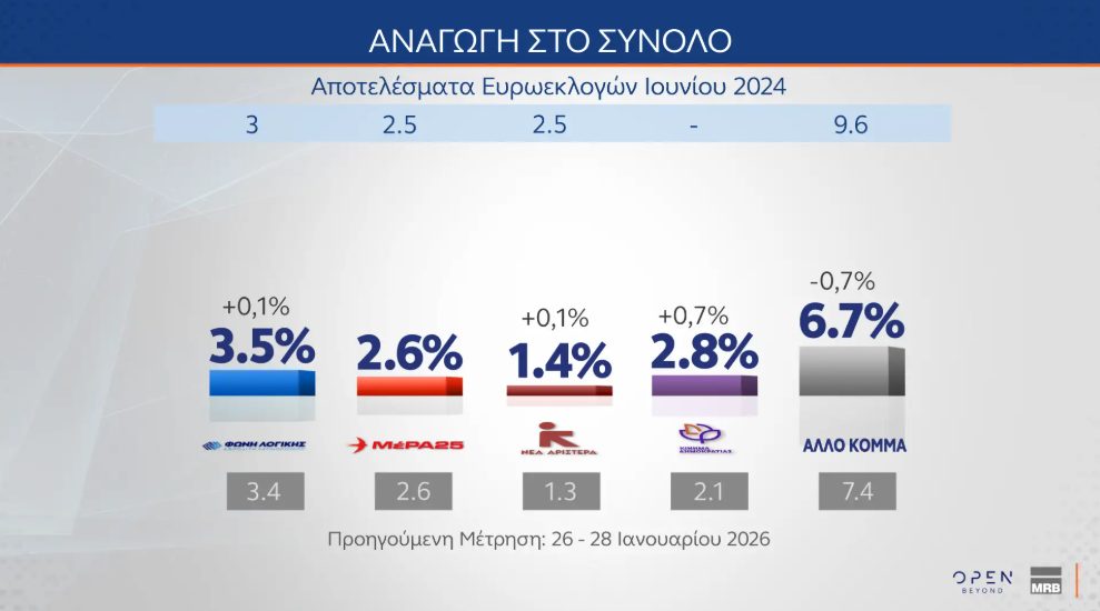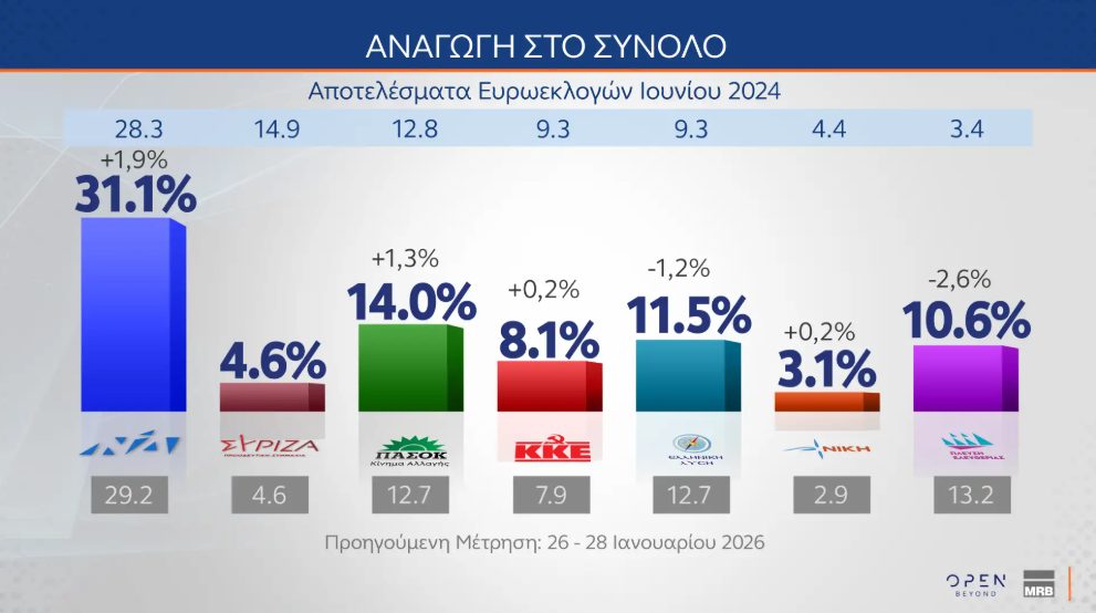 Πρωτιά της Νέας Δημοκρατίας με μεγάλη διαφορά από το δεύτερο ΠΑΣΟΚ καταγράφει η δημοσκόπηση της MRB για το κεντρικό δελτίο ειδήσεων του Open, ενώ ενδιαφέρον παρουσιάζουν οι απόψεις για τον πόλεμο στη Μέση Ανατολή.