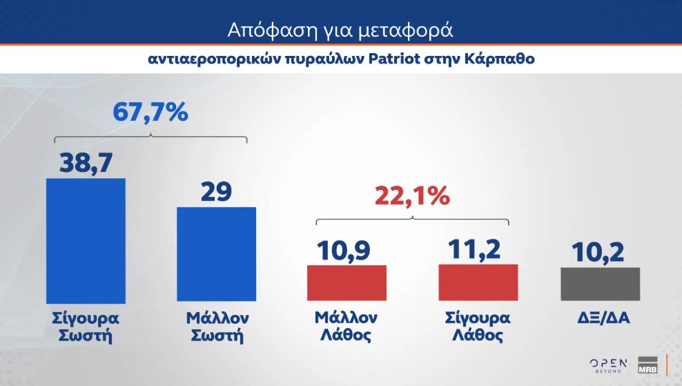 Αναφορικά με τον πόλεμο στη Μέση Ανατολή οι πολίτες είναι αντίθετοι στην εμπλοκή της χώρας μας με οποιονδήποτε τρόπο ενώ συμφωνούν με την αποστολή στρατιωτικής βοήθειας στην Κύπρο και με τους Patriot στην Κάρπαθο.