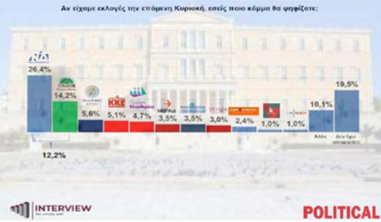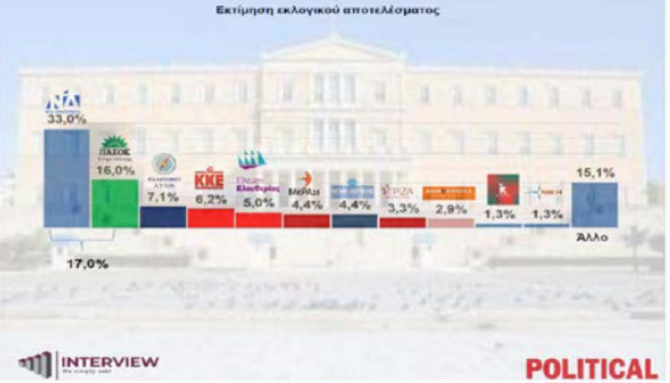Προβάδισμα 17 μονάδων καταγράφει η Νέα Δημοκρατία στην εκτίμηση εκλογικού αποτελέσματος, έναντι του ΠΑΣΟΚ σε νέα δημοσκόπηση της Interview για λογαριασμό της Political.