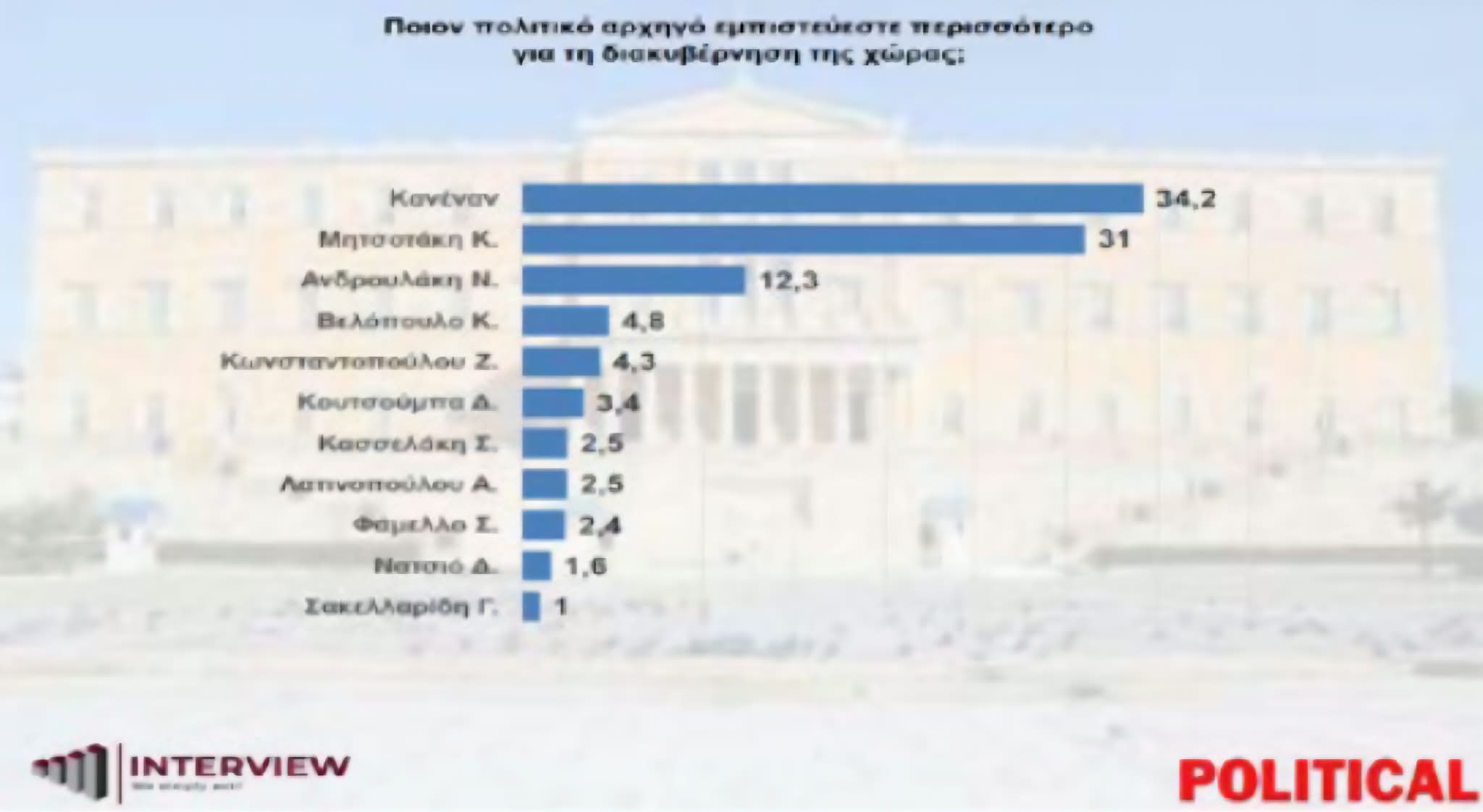 Ακολουθούν ο Κυριάκος Βελόπουλος με 4,8%, η Ζωή Κωνσταντοπούλου με 4,3%, ο Δημήτρης Κουτσούμπας με 3,4%, ο Στέφανος Κασσελάκης με 2,5%, η Αφροδίτη Λατινοπούλου με 2,5%, ο Σωκράτης Φάμελλος με 2,4%, ο Δημήτρης Νατσιός με 1,6% και ο Γαβριήλ Σακελλαρίδης με 1%.