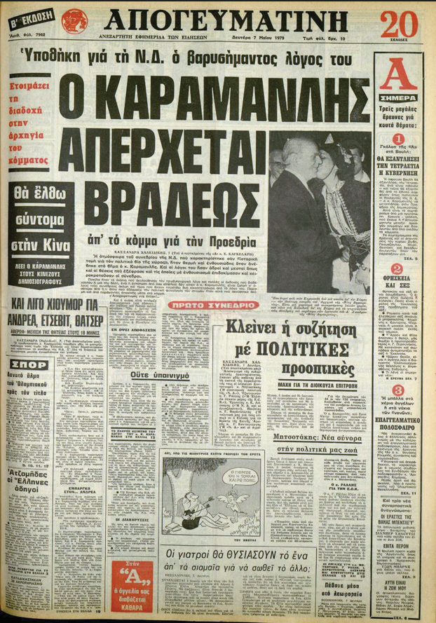 Με αφορμή τη διεξαγωγή του 15ου Συνεδρίου της Νέας Δημοκρατίας το προσεχές Σαββατοκύριακο (5-7 Απριλίου 2024) στο Ζάππειο, η «Απογευματινή» κάνει μια αναδρομή στην ιστορία της μεγάλης κεντροδεξιάς παράταξης που φέτος συμπληρώνει μισό αιώνα ζωής. Μέσα από το ιστορικό αρχείο της «Α» παρουσιάζονται τα εμβληματικά πρωτοσέλιδα της εφημερίδας και το πλούσιο ρεπορτάζ για τα συνέδρια της Νέας Δημοκρατίας από το 1979 και το 1ο τακτικό Συνέδριο της Νέας Δημοκρατίας που πραγματοποιήθηκε στη Χαλκιδική τον Μάιο του 1979.