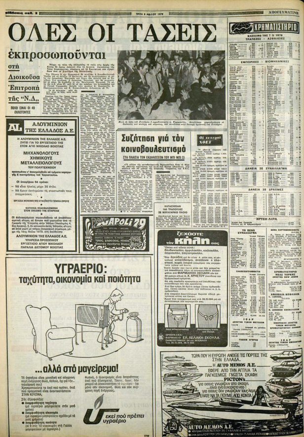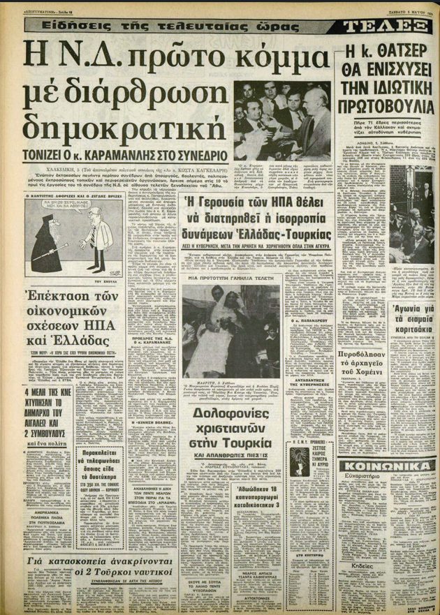 Ο απεσταλμένος στην Κασσάνδρα της Χαλκιδικής πολιτικός συντάκτης της «Α», Κώστας Καγκελάρης, με πλούσιο ρεπορτάζ στην εφημερίδα μετέφερε τις εξελίξεις από το ιστορικό 1ο Συνέδριο της ΝΔ, όπου όπως γράφει το Σάββατο 5 Μαΐου 1979: «Ενώπιον 850 περίπου συνέδρων… άρχισε σήμερα στις 10 το πρωί τις εργασίες του το συνέδριο της Νέας Δημοκρατίας… Την κήρυξη των εργασιών έκανε ο αντιπρόεδρος της κυβερνήσεως Κ. Παπακωνσταντίνου και ακολούθως διακοπτόμενος συνεχώς και επευφημούμενος με έντονες εκδηλώσεις άρχισε και συνεχίζει την ομιλία του ο Κωνσταντίνος Καραμανλής, του οποίου οι λόγοι παρακολουθούνται με κατανυκτική προσήλωση». Στο 1ο Συνέδριο της ΝΔ εγκρίθηκαν ομόφωνα όλες οι ιδεολογικές αρχές τις οποίες εισηγήθηκε ο Κωνσταντίνος Καραμανλής και ορίστηκε η ιδεολογική ταυτότητα της Νέας Δημοκρατίας ως κόμματος του ριζοσπαστικού φιλελευθερισμού που αναγνωρίζει την ελευθερία της αγοράς με ρυθμιστική, ωστόσο, παρέμβαση του κράτους για λόγους κοινωνικής δικαιοσύνης. «Ο Κωνσταντίνος Καραμανλής έφτασε χθες το απόγευμα στη Χαλκιδική έπειτα από μια εντυπωσιακή διαδρομή από τη Θεσσαλονίκη μέχρι την Κασσάνδρα, όπου κατά μήκος της δημόσιας οδού είχαν συρρεύσει πυκνά πλήθη κατοίκων των γύρω γύρω χωριών, οι οποίοι τον υποδέχτηκαν με εξαιρετική εγκαρδιότητα. Τούτο προκάλεσε καθυστέρηση μιας ώρας περίπου μέχρις ότου φτάσει στον προορισμό του», έγραφε η λεζάντα που συνόδευσε τη φωτογραφία του Κωνσταντίνου Καραμανλή από τη θερμή υποδοχή του στη Χαλκιδική.