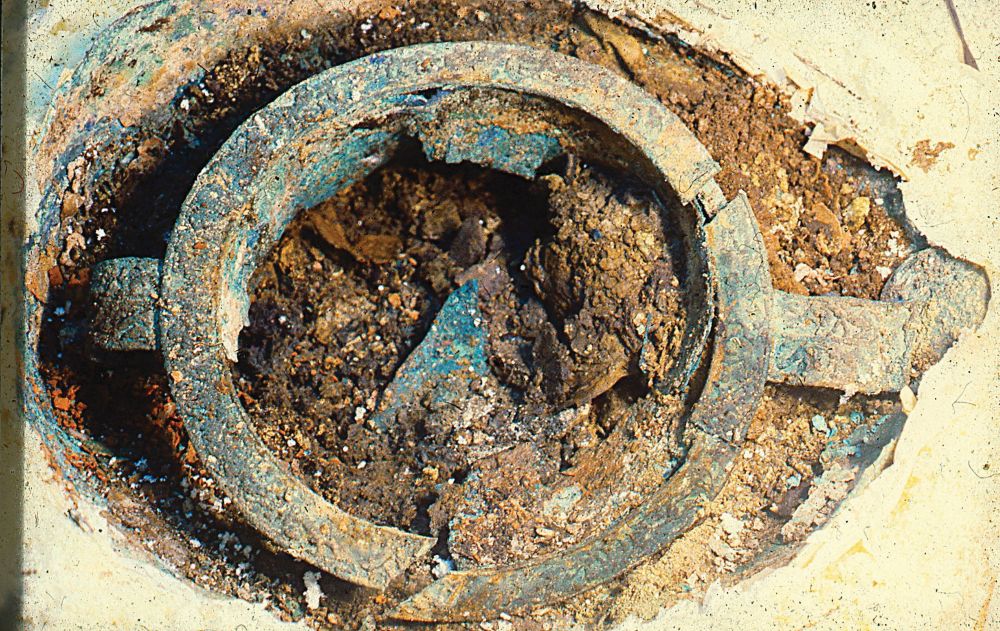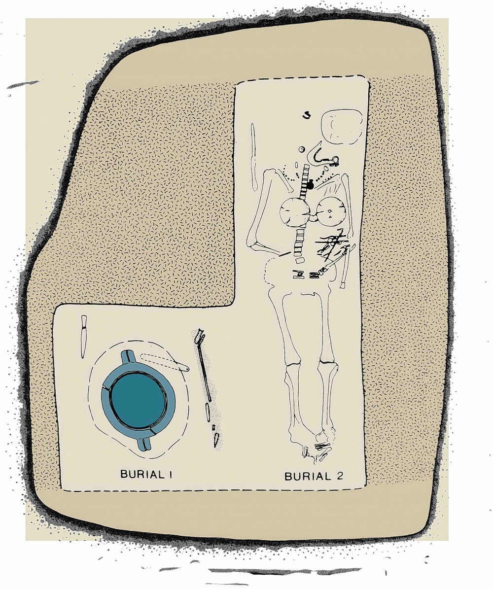 Εκεί τα οστά του αποτεφρωμένου άνδρα ήταν τυλιγμένα στο ύφασμα και τοποθετημένα στο εσωτερικό χάλκινου τεφροδόχου αγγείου. Στον ίδιο τάφο, οι αρχαιολόγοι εντόπισαν τα όπλα του νεκρού και τα σκελετικά κατάλοιπα μιας νέας γυναίκας με πολύτιμα κοσμήματα. Σε διπλανό σκάμμα είχαν θυσιαστεί τέσσερα νεαρά άλογα, πρακτική που θυμίζει έντονα τον ομηρικό τρόπο ταφής ενός ήρωα.