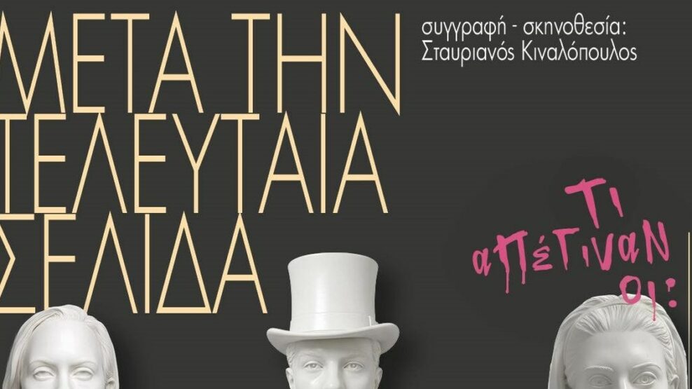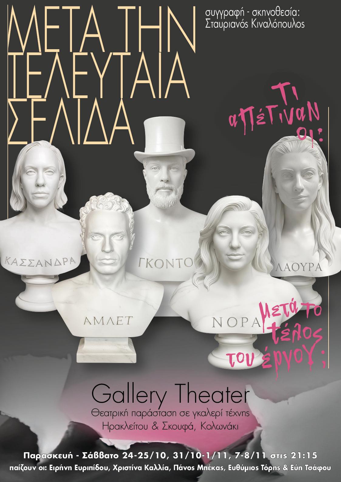 Την Παρασκευή 24 Οκτωβρίου κάνει πρεμιέρα στο Gallery Theater (Γκαλερί Ευριπίδη- Ηρακλείτου 10 και Σκουφά ), στο Κολωνάκι , η παράσταση «Μετά την τελευταία σελίδα».