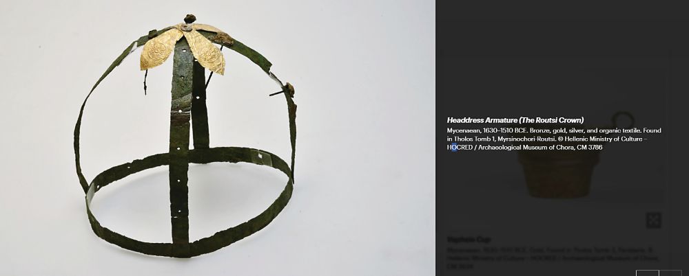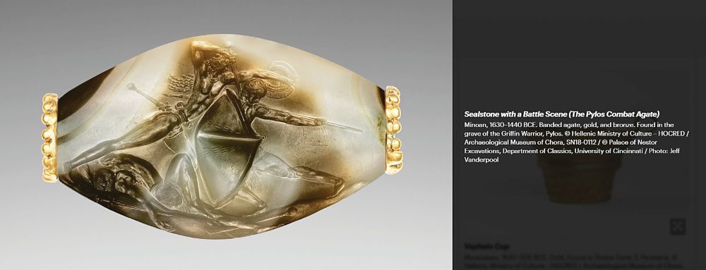 Είναι όμως και η μοναδική έκθεση «The Kingdom of Pylos: Warrior-Princes of Ancient Greece» που τρέχει από τον Ιούνιο, όπως έχουμε τονίσει, και θα συνεχιστεί έως τον Ιανουάριο. Ειδικότερα, μεταφράζεται στην πρώτη έκθεση με μυκηναϊκές αρχαιότητες που παρουσιάζεται στην Αμερική και, σε αυτό το πλαίσιο, οι ειδικοί του μουσείου ξεχωρίζουν, μεταξύ 10 εκθεμάτων, σπαθιά από χρυσό και χαλκό (1520-1440 π.Χ.), τον ξακουστό πια σφραγιδόλιθο του Γρύπα Πολεμιστή (630-1440 π.Χ.), που θεωρείται το πιο έξοχο δείγμα της Εποχής του Χαλκού, ακόμα παλαιότερες τοιχογραφίες άψογα διατηρημένες (1240-1190 π.χ.) και στέμμα από χρυσό και ασήμι (1630-1510 π.Χ.). Συνολικά 1.500 πλούσια κτερίσματα αποτυπώνουν με ευκρίνεια την αίγλη του μυκηναϊκού πολιτισμού, με τους χιλιάδες καθημερινά επισκέπτες να μη χορταίνουν να τα θαυμάζουν.