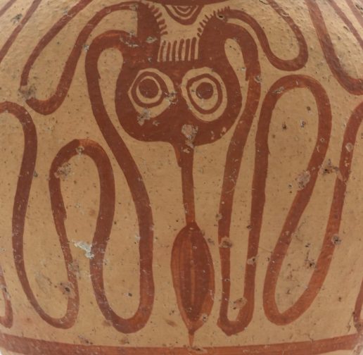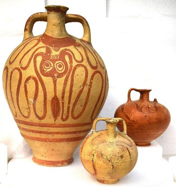 Τα μεγάλα ζωγραφιστά χταπόδια που διακοσμούν τις επιφάνειες των αγγείων τυλίγουν σφιχτά τα σώματά τους, προκαλώντας το ενδιαφέρον για τον συμβολισμό του θαλάσσιου πλάσματος στη μινωική θρησκεία. Το χταπόδι φαίνεται να εκφράζει τη δύναμη, τη ρευστότητα και την αινιγματική σχέση ζωής και θανάτου μέσα στη μινωική θεολογία.