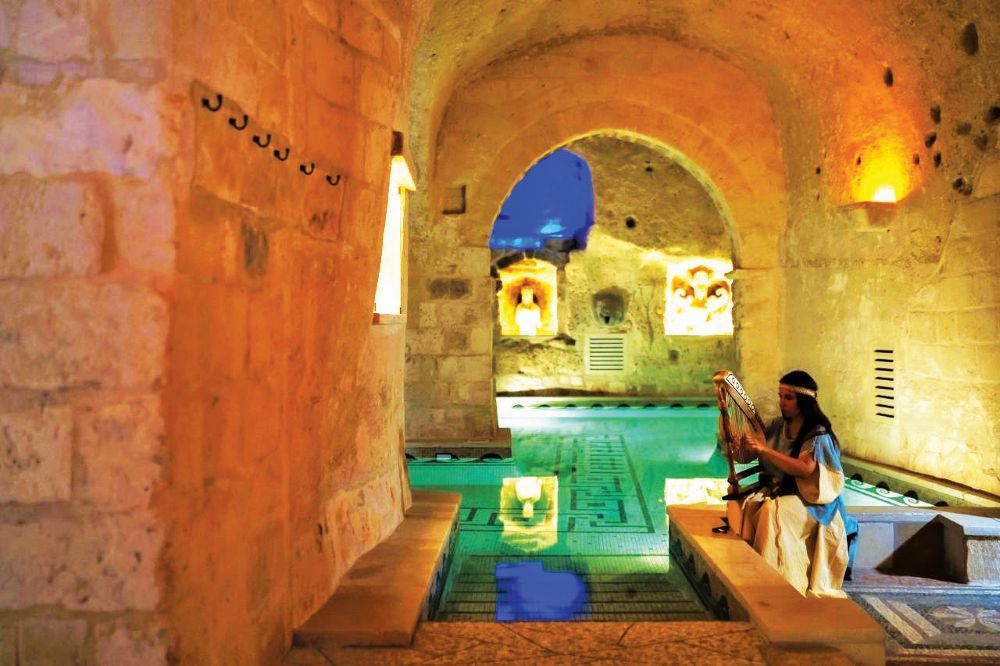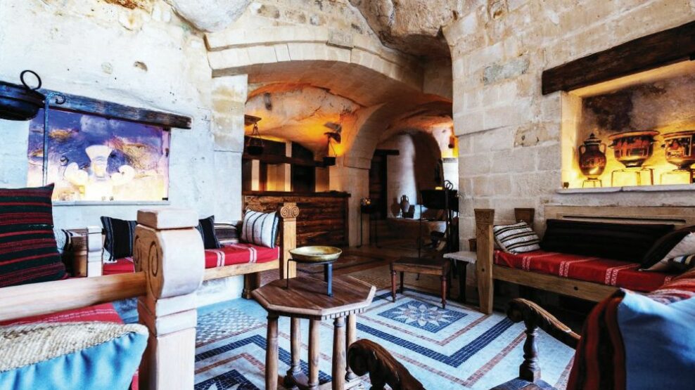 Δεν είναι τυχαίο ότι στεγάζεται σε αναστηλωμένες σπηλαιώδεις κατοικίες (sassi) – μνημεία παγκόσμιας κληρονομιάς της UNESCO. H αποκατάστασή τους διήρκεσε τέσσερα χρόνια και στην τωρινή του διαμόρφωση ρόλο-κλειδί έπαιξαν εξειδικευμένοι αρχιτέκτονες, αρχαιολόγοι και ιστορικοί. Όλα τα έπιπλα, σκεύη, φωτιστικά, μουσικά όργανα και υφάσματα σχεδιάστηκαν ως ακριβείς αναπαραστάσεις αρχαιολογικών ευρημάτων. Από τις 16 υπόγειες κατοικίες, οι οκτώ διαμορφώθηκαν σύμφωνα με την αισθητική και τις πρακτικές της αρχαϊκής και ελληνιστικής περιόδου. Οι άλλες μισές αντλούν στοιχεία από παλαιότερες εποχές της περιοχής, από τη λίθινη μέχρι τη ρωμαϊκή περίοδο.