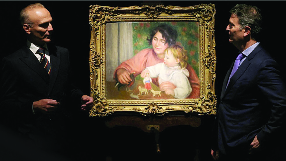 Άγνωστος πίνακας του ευφυούς ιμπρεσιονιστή Πιερ-Ογκίστ Ρενουάρ, που απεικονίζει τον μικρότερο γιο του, Ζαν (και διαχρονικό σκηνοθέτη, από τους «ηγέτες» του γαλλικού σινεμά που απέσπασε τιμητικό Oscar για τη συμβολή του στον παγκόσμιο κινηματογράφο το 1975) μωρό, στην αγκαλιά της νταντάς του, πουλήθηκε για 1.800.000 ευρώ. Tο έργο, που διατηρείται σε εκπληκτική κατάσταση και φέρει τον τίτλο «Το παιδί και τα παιχνίδια του – Η Γκαμπριέλ και ο γιος του ζωγράφου, Ζαν» ξεπέρασε τις προσδοκίες του οίκου δημοπρασιών Druo – οι εξπέρ το είχαν εκτιμήσει μεταξύ 1.000.000 και 1.500.000 ευρώ. Η ελαιογραφία, φτιαγμένη μεταξύ 1890 και 1895, έχει και συναισθηματική, πέρα από ιστορική, αξία καθώς ουδείς μέχρι τον περασμένο μήνα που ανακοινώθηκε, δεν είχε ιδέα για την ύπαρξή της, κάτι που αυτομάτως την αναβάθμισε στα μάτια των συλλεκτών. Ο πίνακας σαφώς έχει τη δική του ιστορία: είχε περάσει στην κατοχή της νονάς του Ζαν, Ζαν Μποντό, η οποία τον κληροδότησε στους οικείους της. Εκείνοι, λοιπόν, τώρα, έχοντάς τον κρατήσει επί έναν αιώνα και πλέον μακριά από τα φώτα της δημοσιότητας, αποφάσισαν να τον διαθέσουν προς πώληση. Εκ του αποτελέσματος, πολύ καλά έκαναν.