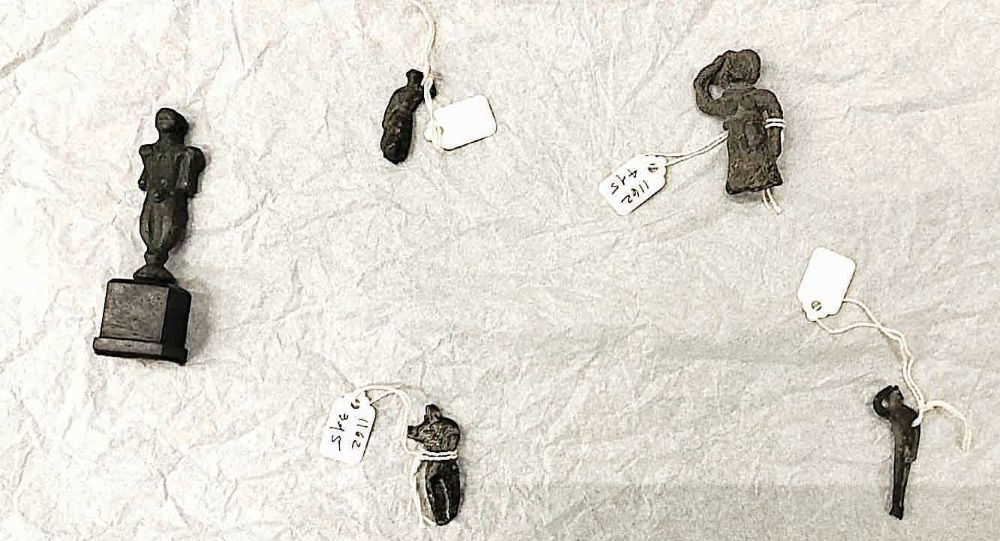 Το μαρμάρινο αναθηματικό ανάγλυφο (ύψους 52 εκατοστών και αντίστοιχα πλάτους 92 εκατοστών) έχει τη μορφή ναΐσκου και στην παράσταση εικονίζεται η Άρτεμις, όρθια και επιβλητική, με τη φαρέτρα να προβάλει πίσω από τη ράχη της. Τα χάλκινα ειδώλια, τρία ανδρικά και δύο γυναικεία (ύψους περίπου 6 εκατοστών), ακολουθούν τον τύπο του λατρευτή με το ανασηκωμένο στην κεφαλή της δεξιάς χειρός, χαρακτηριστική χειρονομία της δέησης απέναντι στη θεότητα. Όλα τα αντικείμενα παραδόθηκαν στο Αρχαιολογικό Μουσείο του Πειραιά.