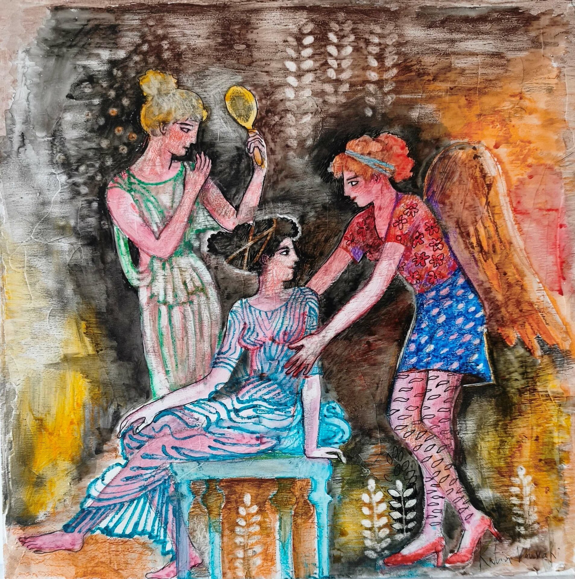 Τα έργα παρουσιάζουν μορφές όπως θαλασσινές σειρήνες, νύμφες, φτερωτές θεές, ημίθεες και σύγχρονες δυναμικές γυναίκες, δημιουργώντας έναν διάλογο ανάμεσα στον αρχαίο μύθο και το σύγχρονο βλέμμα.