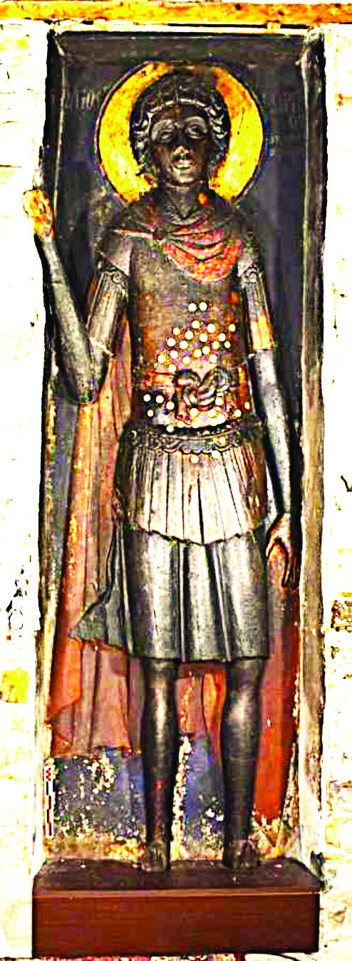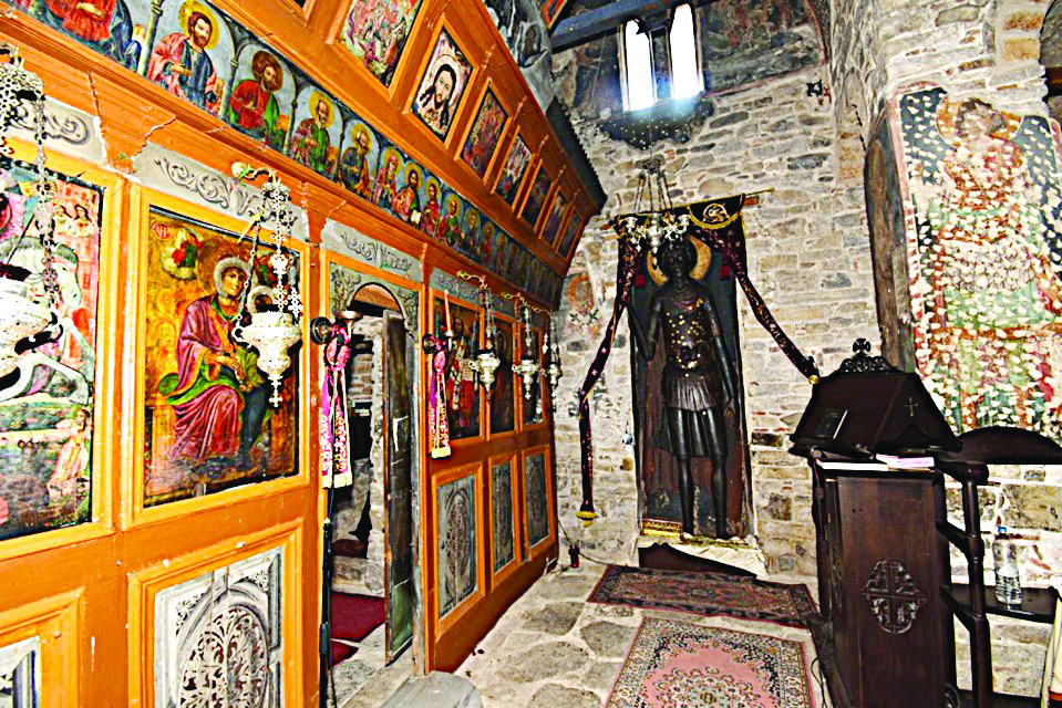 Όσο για την ανάγλυφη εικόνα του Αγίου Γεωργίου, τοποθετημένη στον νότιο τοίχο του ναού, σε κόγχη, κατασκευάστηκε από μονοκόμματο ξύλο καρυδιάς με πρόσθετο τμήμα στον πήχυ. Συνδέεται με μεταλλικά καρφιά και είναι ζωγραφισμένη με την τεχνική της αυγοτέμπερας, με λεπτή προετοιμασία και βερνίκι προστασίας στην επιφάνεια. Το ότι φέρει επιχρύσωση στο φωτοστέφανο, την καθιστά σπάνιο κομψοτέχνημα που, πλέον, αναδεικνύεται όπως του αξίζει.