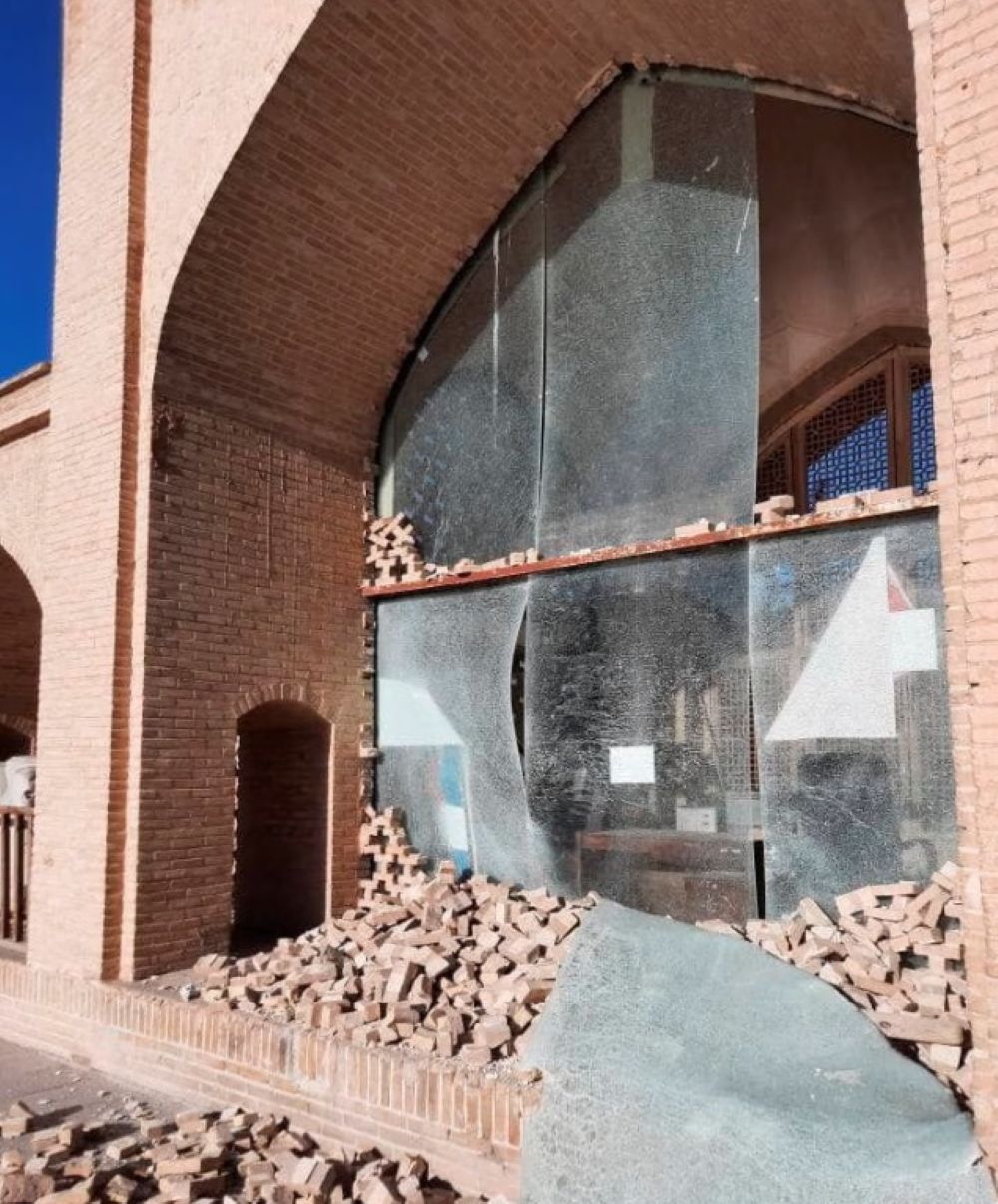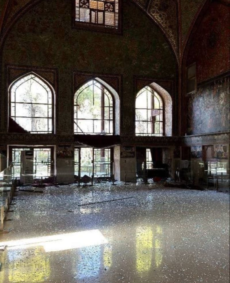 Η Υψηλή Πύλη (Ali Qapu), στην ίδια πόλη, έχει μισοκαταστραφεί, με τα σπασμένα γυαλιά να μεταφράζονται στο πρώτο που καταγράφει ο φακός. Εκεί «πρυτανεύουν» έργα τέχνης-κειμήλια που προδίδουν το αυτοκρατορικό της παρελθόν: Χτίστηκε στα τέλη του 16ου – αρχές 17ου αιώνα με εντολή του Σάχη Αμπάς Α’ της δυναστείας των Σαφαβιδών, όταν μετέφερε την πρωτεύουσα στο Ισφαχάν. Αρχικά σχεδιάστηκε ως μνημειώδης είσοδος για τα παλάτια που εκτείνονταν πίσω της, αλλά εξελίχθηκε σε εξαώροφο κτίριο 48 μέτρων που λειτουργούσε ως κατοικία και διοικητικό κέντρο. Έγινε γνωστό για την επιβλητική του βεράντα με τις χαρακτηριστικές ξύλινες κολώνες, απ’ όπου οι Σάχεις παρακολουθούσαν αγώνες πόλο και τελετές στην πλατεία. «Κλου», στον έκτο όροφο, η Αίθουσα Μουσικής, με περίτεχνα γύψινα ανάγλυφα σε σχήμα βάζων: δεν είχαν μόνο διακοσμητική χρήση, αλλά αποδεικνύονταν αναντικατάστατα στην εξάλειψη της ηχούς στη διάρκεια μουσικών παραστάσεων. Οι τοίχοι είναι διακοσμημένοι με νατουραλιστικές τοιχογραφίες από τον διάσημο ζωγράφο της αυλής, Reza Abbasi, και τους μαθητές του. Και τώρα; Θρύψαλα παντού. Στον δε αύλειο χώρο: τούβλα, τσιμεντόλιθοι, πλακάκια που κάποτε δεν πατιούνταν διότι -απλώς- ήταν κομψοτεχνήματα… Αλλιώς, τα θλιβερά απομεινάρια του πολέμου.