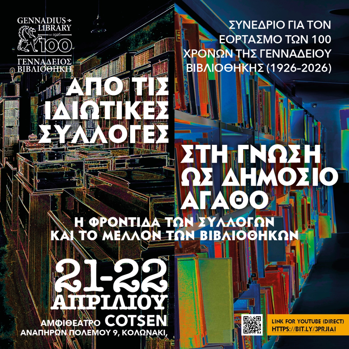 Στο πλαίσιο των εορτασμών για τη συμπλήρωση ενός αιώνα λειτουργίας της, η Αμερικανική Σχολή Κλασικών Σπουδών στην Αθήνα διοργανώνει στις 21 και 22 Απριλίου 2026 διεθνές συνέδριο με τίτλο «Από τις Ιδιωτικές Συλλογές στη Γνώση ως Δημόσιο Αγαθό. Η φροντίδα των συλλογών και το μέλλον των βιβλιοθηκών».