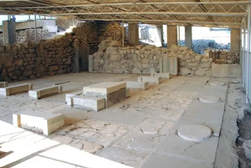 Τα υφιστάμενα στέγαστρα κατασκευάστηκαν τη δεκαετία του ΄60, και μέχρι σήμερα προστάτευσαν επαρκώς τα εξαιρετικά ευπαθή κατάλοιπα. Δύο στέγαστρα καλύπτουν τα Βασιλικά Διαμερίσματα και τμήμα των Παλαιών Ανακτόρων, ενώ τρία μικρότερα στέγαστρα καλύπτουν το Δωμάτιο –για την προστασία των πίθων που βρίσκονται κατά χώραν- τον χώρο του Κλιβάνου -για την προστασία των ευαίσθητων πηλοκονιαμάτων, με τα οποία έχουν επιχριστεί οι επιφάνειες του-, και τον δυτικό προμαχώνα, προκειμένου να προστατευθεί ο μάρτυρας στρωματογραφίας, που σώζεται εκεί. Τα νέα στέγαστρα λαμβάνουν υπόψη την ανάγκη για πλήρη προστασία των υποκείμενων καταλοίπων, τη μείωση στο ελάχιστο της διεπαφής μεταξύ νέων δομικών στοιχείων και των αρχαίων τοίχων, την αποφυγή οριζοντίων υδροσυλλεκτών στις άκρες των στεγάστρων.