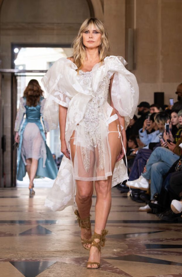 Παρίσι, το μεγάλο μας τσίρκο. Η Κέιτ Μος είναι παντού, μόνη ή με την κόρη της Λίλα Μος. Οι φωτογράφοι την πολιορκούν, το TikTok λατρεύει να συνοδεύει κάθε της παραστράτημα με emoji με νιφάδες χιονιού και λεζάντα: «πάλι χιονίζει» και όποιος κατάλαβε, κατάλαβε. Η Κλόντια Σίφερ εμφανίστηκε στο σόου του οίκου Chloe σα να μην πέρασε μια μέρα. Η Ναόμι Κάμπελ παρήλασε για διαφορετικά brands ως απόλυτη γαζέλα. Η Χάιντι Κλουμ δεν έχασε την ευκαιρία να ποζάρει ξανά και ξανά, ημίγυμνη. Φόρεσε χρυσά δόντια, έκλεισε το φινάλε στη συλλογή της Βίβιεν Γουέστγουντ, με νυφικό μπέιμπι-ντολ.