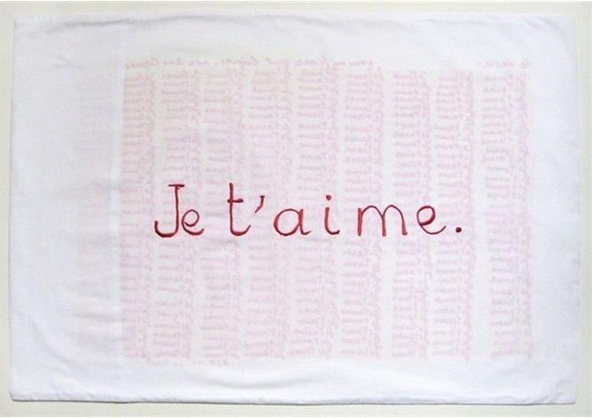 Μπορεί να λειτουργήσει σαν meditation. Θυμάμαι κάτι λευκές μαξιλαροθήκες που είχα βρει στο πωλητήριο ενός μουσείου με την επαναλαμβανόμενη φράση “Je t’aime” από έργο της σπουδαίας καλλιτέχνιδας, Λουίζ Μπουρζουά (1911-2010). Kόκκινες κλωστές σε λευκά σεντόνια. Σαν μια ερωτική επιστολή σε εξέλιξη.